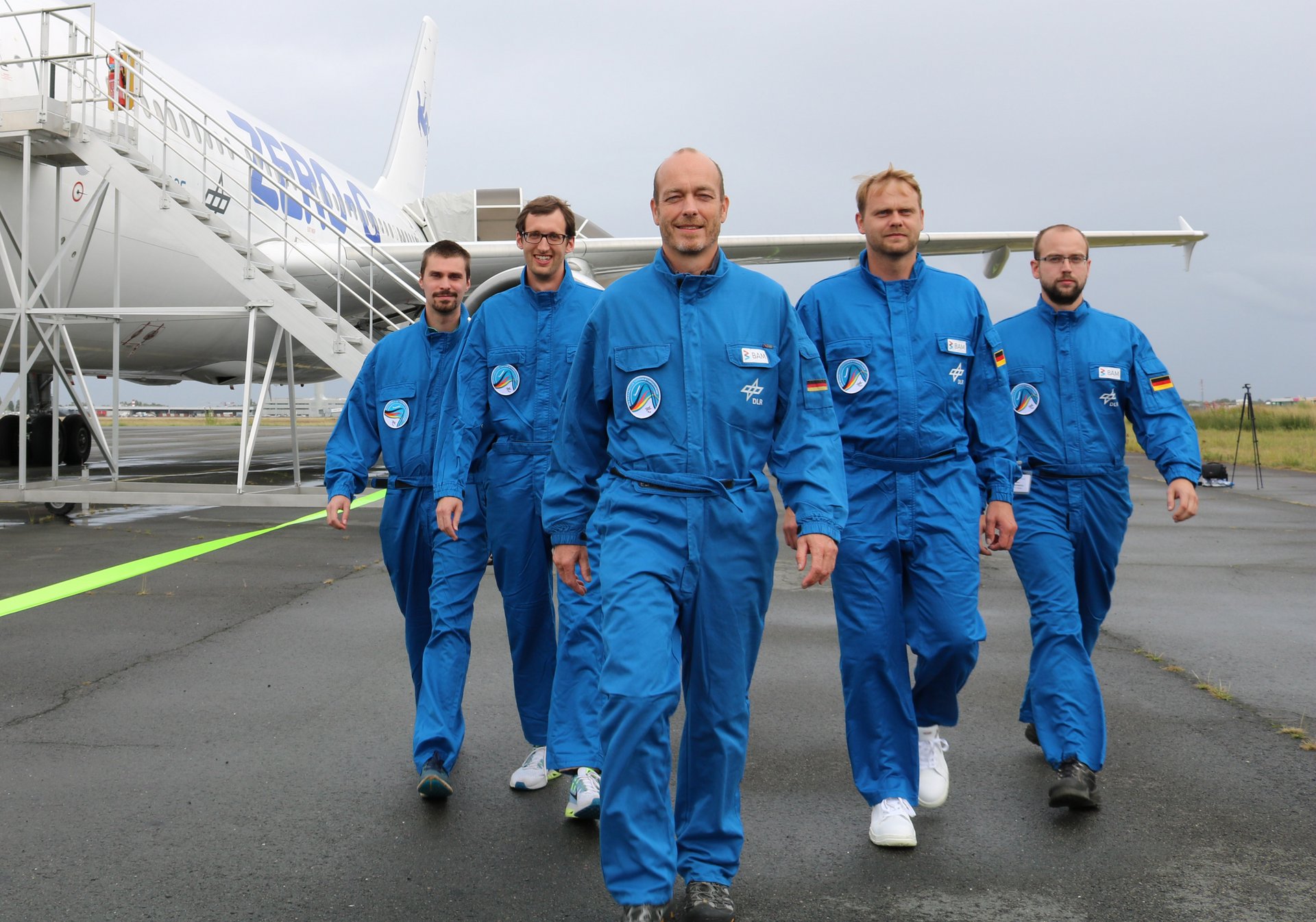 Auf dem Mond könnten mithilfe innovativer 3D-Drucktechnologie und Mondstaub „Pflastersteine“ erstellt werden, die sich dann zu einer Art Straße (Fotomontage) zusammenfügen lassen. Die Fertigung der Pflasterelemente würde mittels Laser bzw. gebündeltem Sonnenlicht erfolgen (siehe Bilder unten). Prof. Jens Günster (Bild unten rechts, vorne) beschäftigt sich seit mehreren Jahren mit 3D-Druck in der Schwerelosigkeit und hat mit einem Team schon zahlreiche Parabelflüge absolviert. Fotomontage: RegoLight Consortium 2018, visualization: LIQUIFER Systems Group, weitere Fotos: BAM/TUC