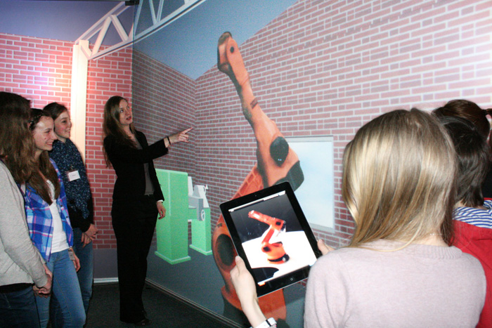 Einer der Gastgeber war beispielsweise das Institut für Maschinelle Anlagentechnik und Betriebsfestigkeit (IMAB). Sechs Mädchen lernten die moderne Fabrikplanung mit Hilfe von innovativen Methoden kennen. Dabei stellte der Einsatz von iPads einen Schwerpunkt dar. Hiermit wurde es den Teenagern ermöglicht, selbstständig aus einzelnen Fotoaufnahmen ein 3D-Modell eines Industrieroboters zu erstellen und es anschließend in das „Virtual-Reality-Labor“ zu übertragen. Weitere Einblicke erhielten die Schülerinnen bei einer Layout-Planung. Dabei lösten die Mädchen eigenständig Aufgaben mit Hilfe eines Planungstisches, der eine 2D- und 3D-Sicht der zu planenden Fabrikhalle ermöglicht.