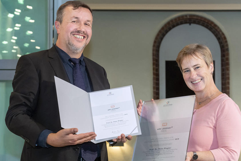 Die Übergabe des mit 50.000 Euro dotierten Ars legendi-Preises fand am 24. Oktober in Berlin statt. Die Jury würdigt damit die jahrelange Erforschung der Lehre als wissenschaftliche Tätigkeit, bei der sich Professor Riegler fortwährend mit den Verständnisschwierigkeiten der Studierenden auseinandersetzt. Dabei gelingt ihm die Symbiose von wissenschaftlich anerkannten didaktischen Methoden und digitalen Techniken. Er setzt didaktisch insbesondere auf die das Just-in-Time-Teaching (JiTT). In mehreren Reflektionsschleifen hat er mittels des Einsatzes von Instrumenten der Wirksamkeitsforschung seine Ergebnisse hinterfragt und in einem steten Qualitätsentwicklungsprozess weiterentwickelt. Seine Ergebnisse stellt der Experte regelmäßig Lehrenden und der Hochschuldidaktik zur Verfügung.