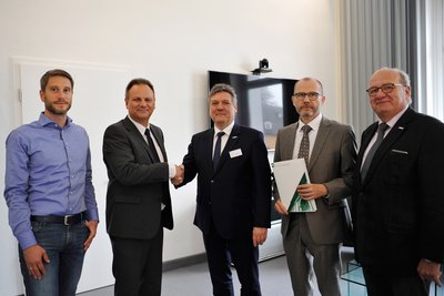 Kooperation zwischen TU und Fachschule für Wirtschaft und Technik (FWT) ausgebaut (von links): Diplom-Ingenieur Alexander Hutwalker, FWT-Direktor Dr. Michael Richter, TU-Präsident Professor Joachim Schachtner, Professor Gunther Brenner (Vizepräsident für Studium und Lehre) und Professor Oliver Langefeld. Fotos: Ernst