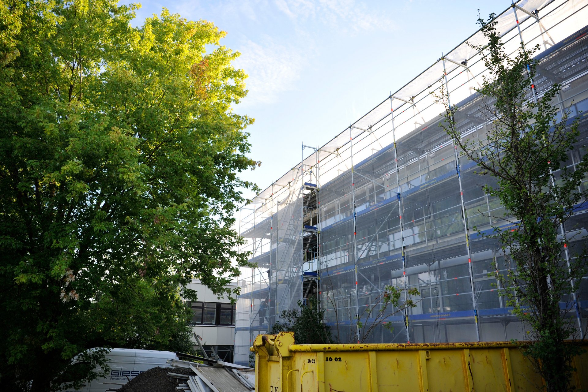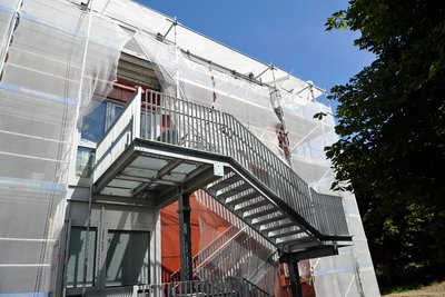 Ebenfalls weithin sichtbar sind die Außenarbeiten in der Agricolastraße. Das eingerüstete IEVB bekommt im Zuge einer energetischen Sanierung ein neues Dach und eine neue Fassade, nachdem die alte Blechfassade abgenommen worden ist. Zudem wird ein neues Labor für die Arbeitsgruppe von Professor Michael Fischlschweiger (Lehrstuhl für Technische Thermodynamik und Energieeffiziente Stoffbehandlung) eingerichtet. Insgesamt belaufen sich die Bauarbeiten an diesem Institut auf etwa 2,5 Millionen Euro. Geplant ist, die Außenarbeiten möglichst bis zum Jahresende fertigzustellen. Die Innenarbeiten, die gerade angelaufen sind, werden zumindest bis zum kommenden Frühjahr dauern.