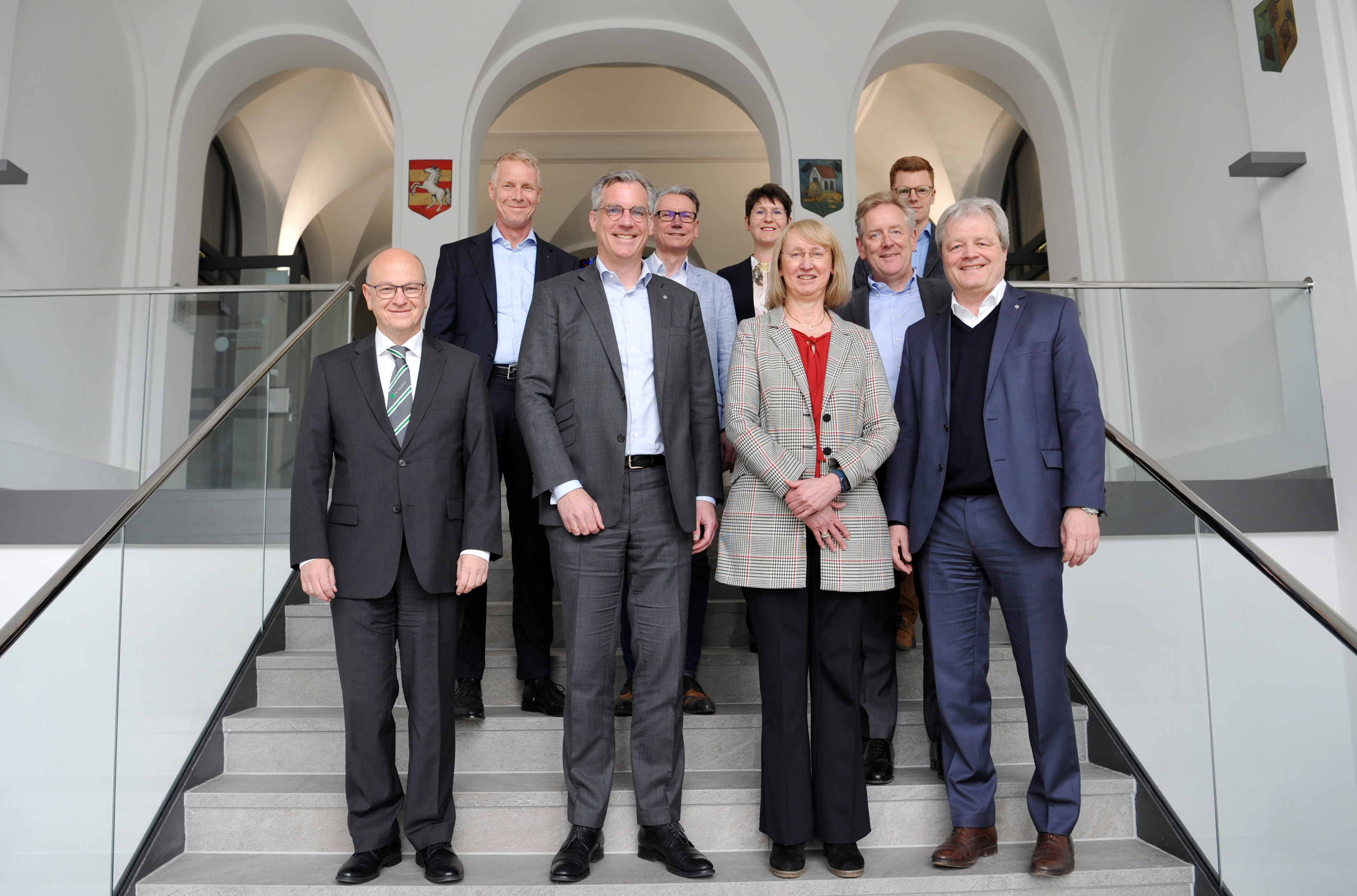 Treffen der TU Clausthal mit der Salzgitter AG (von links): Prof. Daniel Goldmann, Dr. Benedikt Ritterbach, Konzernchef Gunnar Groebler, Prof. Thomas Turek, Prof. Christine Minke, Prof. Heike Schenk-Mathes, Dr. Jens Traupe, Dr. Stefan Mecke und Ulrich Grethe (Vorsitzender Geschäftsführung Salzgitter Flachstahl). Foto: Christian Ernst