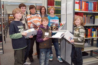 „Man kann sich in den vielen Gängen wirklich verlaufen, überall Bücher“, sagt der 13-jährige Jan von der Realschule Clausthal-Zellerfeld. „Insgesamt stehen in der Universitätsbibliothek rund eine halbe Million Bände“, erläutert Barbara Koch. Die Bibliothekarin stellt den Jungen aus dem Landkreis Goslar ihre tägliche Arbeit vor: Bücher müssen ausgewählt, bestellt, mit Schlagworten versehen und einsortiert werden. Spielerisch schlüpfen die 10- bis 13-Jährigen in diese Rolle. Unterstützt von der örtlichen Buchhandlung Grosse, darf jeder ein Was-ist-was-Buch bestellen, anschließend Schlagworte bestimmen und einen Platz im Regal ausfindig machen.