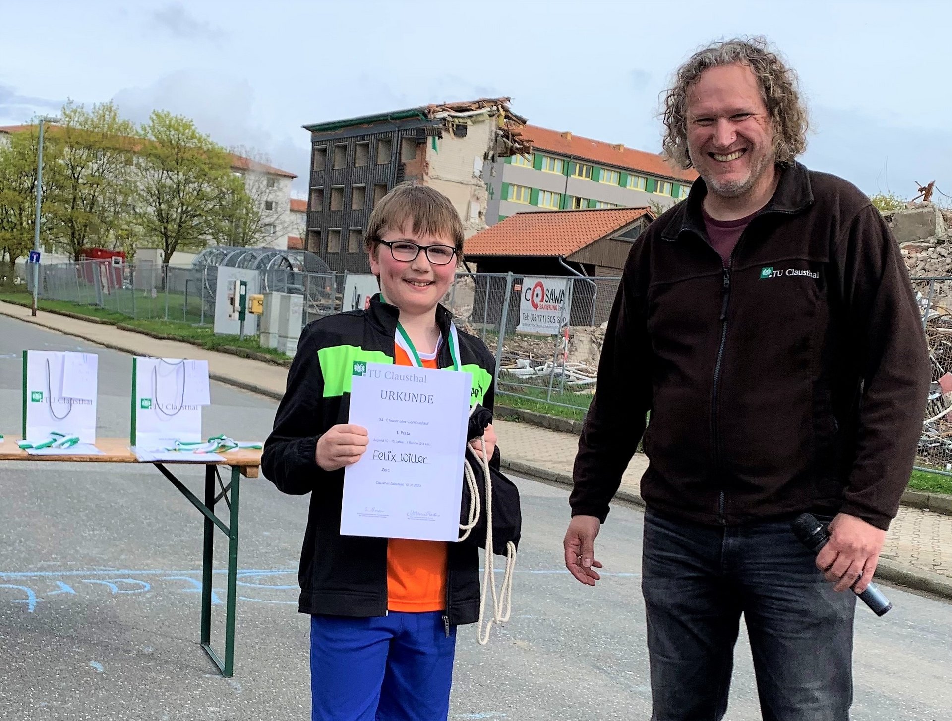 Zum 34. Mal fand der traditionelle Campuslauf der TU Clausthal statt. Sportsgeist und Spaß stehen dabei im Vordergrund: Für eine gelungene Teamleistung erhält das Steiger-College eine Auszeichnung im Teamwettbewerb. Annika Hoppe setzte sich erneut im Lauf der Frauen über 2,8 Kilometer durch. Der jüngste Läufer des Tages ist der 11-jährige Felix Willer. Markus Lettke (SITUC) überreicht ihm die Urkunde für den ersten Platz in der Kategorie "Jugend" (s. Fotos unten). Fotos: Dell'Aquila (2), Apel (2)