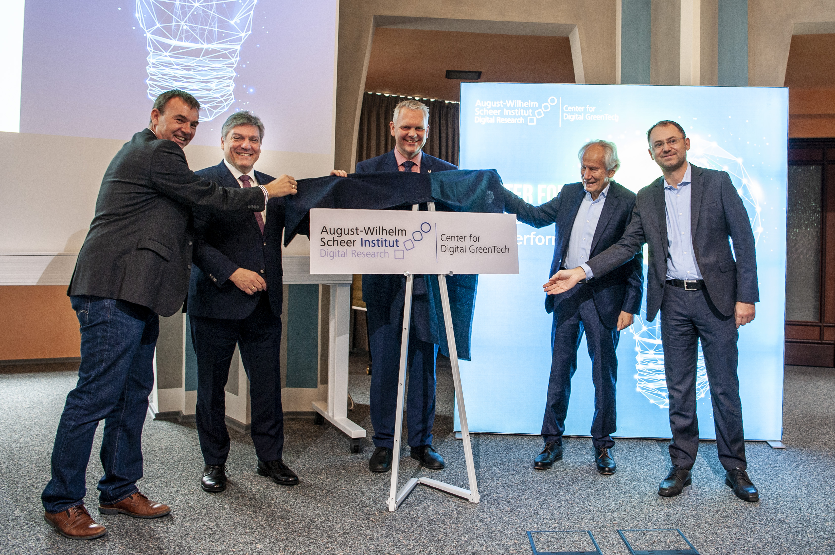 Im Beisein von Wissenschaftsminister Björn Thümler (Mitte) enthüllten (von links) Professor Andreas Rausch, Universitätspräsident Professor Joachim Schachtner, Professor August-Wilhelm Scheer und Dr. Dirk Werth die Tafel des neuen Center for Digital GreenTech. Das Innovationszentrum ist mit einem Festakt inklusive Podiumsdiskussion in der Aula Academica der TU Clausthal (siehe auch Bilder unten) eröffnet worden. Angesichts des Pandemiegeschehens galt die 2G-Regel. Fotos: Ernst und Exner