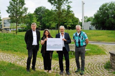 Freuen sich, dass es mit dem Chemie Campus Clausthal jetzt losgeht (von links): Prof. René Wilhelm, Leiter des Instituts für Organische Chemie, die hauptberufliche Vizepräsidentin Irene Strebl, Prof. Arnold Adam, Leiter des Instituts für Anorganische und Analytische Chemie, und Diplom-Ingenieur Thomas Heger, stellvertretender Leiter der Technischen Verwaltung. Auf der Wiese im Hintergrund (hinter der Straße) wird der Neubau des Praktikumsgebäudes entstehen. Foto: Christian Ernst