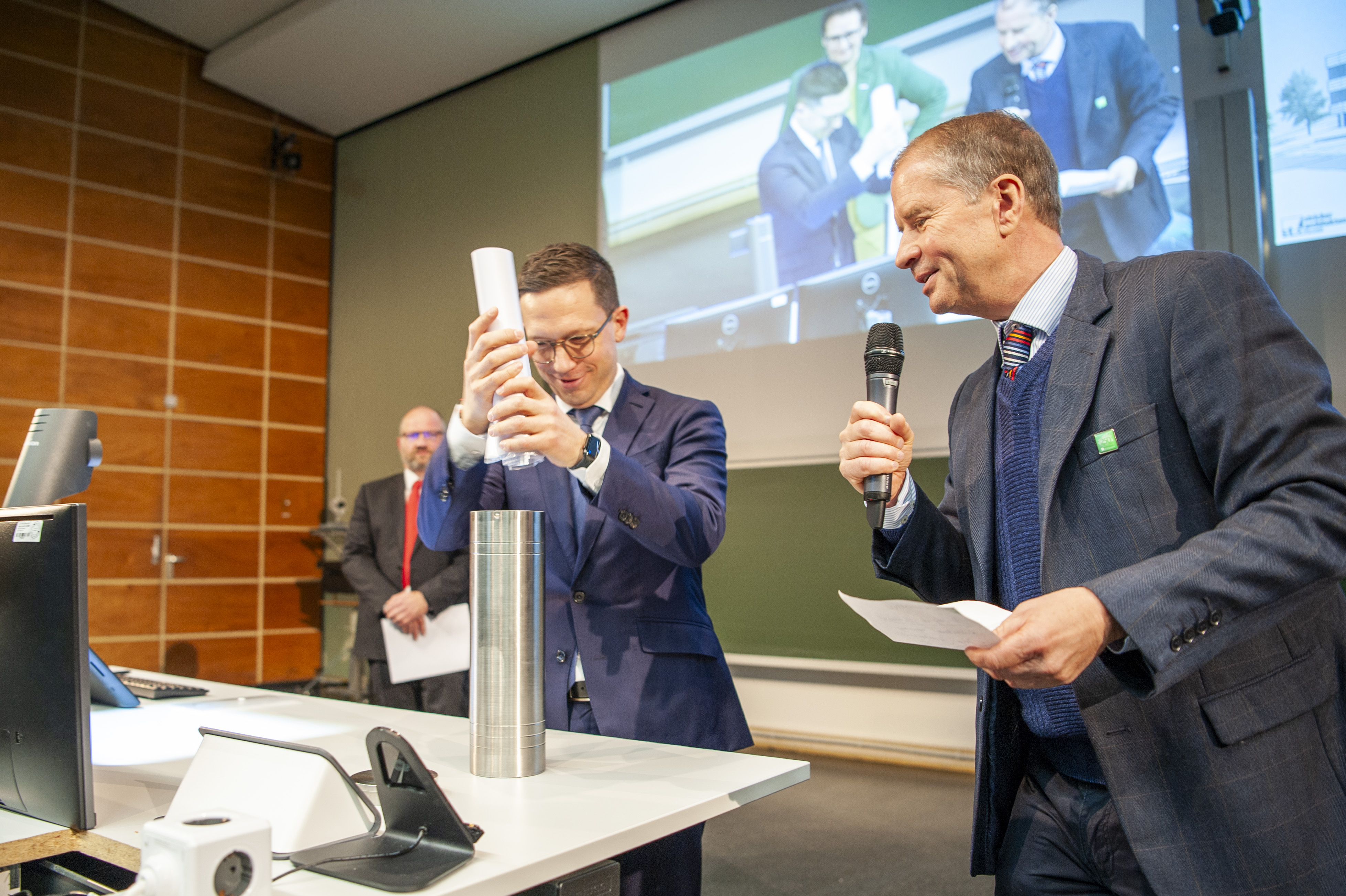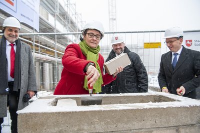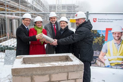 In Anwesenheit von Wissenschaftsminister Mohrs und Finanzminister Heere wird an der TU Clausthal der Grundstein für die größte Baumaßnahme der Harzer Universität seit Jahrzehnten gelegt.