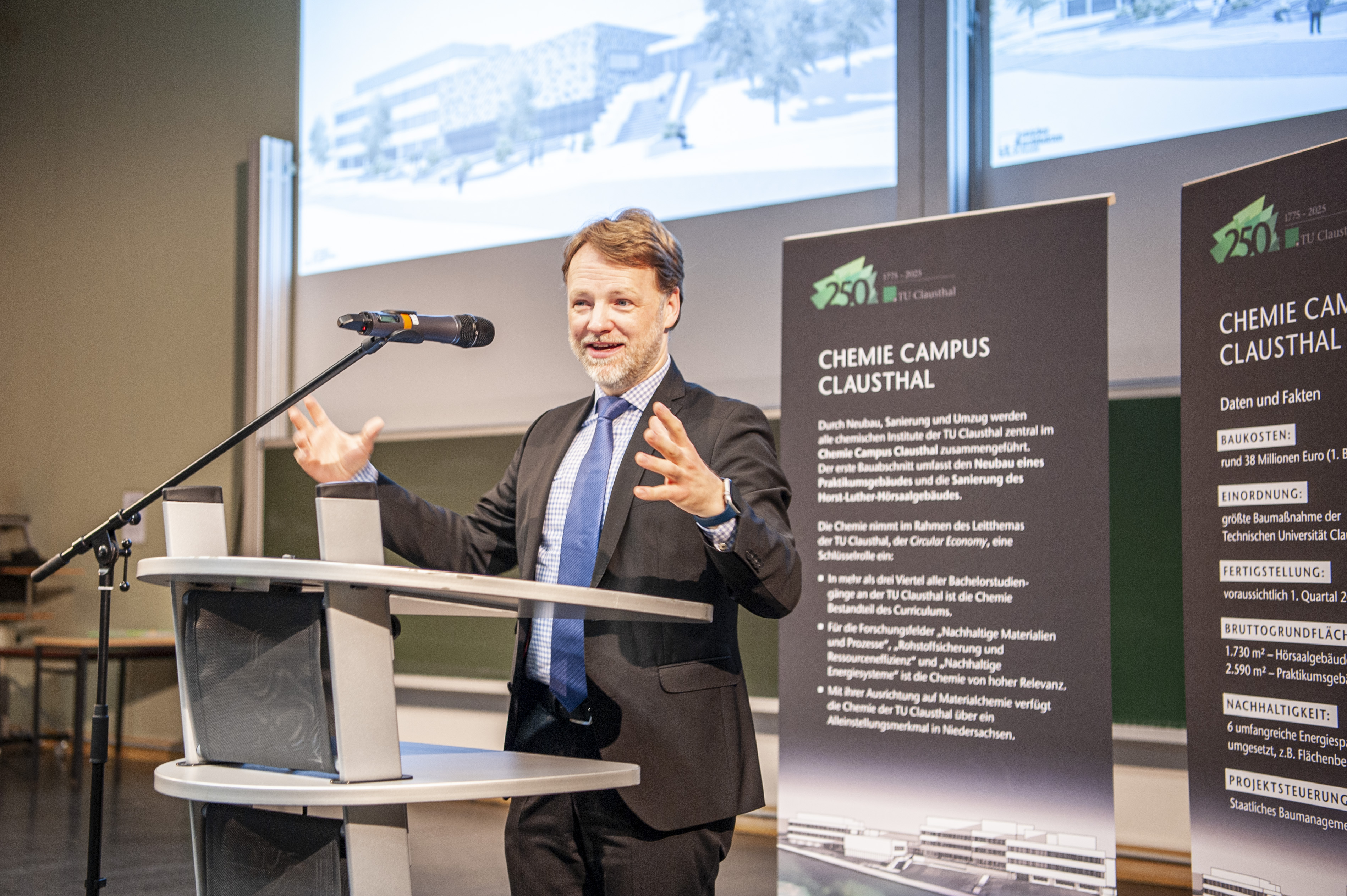 Das Fundament für den Chemie Campus mitten im Zentrum der Universität ist bereits gelegt. „Wir erschaffen für die TU Clausthal einen Gebäudekomplex, der die vorhandene Bausubstanz mit moderner Architektur verbindet“, sagte der Leiter des Staatlichen Baumanagements Südniedersachsen, Marcus Rogge. „Das Ergebnis wird sowohl den höchsten wissenschaftlichen Standards als auch den Bedürfnissen der Studierenden und Beschäftigten entsprechen. Die größte Herausforderung ist dabei, die komplexen Bauarbeiten bei laufendem Universitätsbetrieb durchzuführen.“