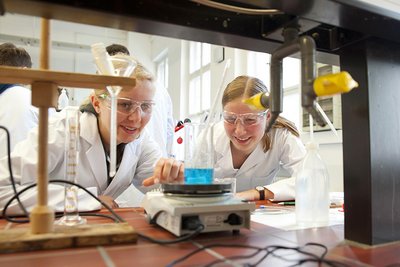 „In diesem Seminar werden die Schülerinnen und Schüler richtig gefordert. Der Anspruch geht deutlich über Schulniveau hinaus“, so Stephanie Eilers. Die Diplom-Chemikerin und Doktorandin vermittelte ihnen in der Auftaktvorlesung Grundlagen der Anorganischen Chemie. Im Anschluss konnten die 15- bis 18-Jährigen unter Aufsicht selbst Hand anlegen. Im großen Praktikumssaal des Instituts ging es, ausgestattet mit Kitteln und Schutzbrillen, um die Synthese von Malachitpulver. Maj-Britt aus Braunschweig und Chiara (Nienburg) setzten die Anweisungen für das Experiment akribisch um. Beide haben an ihrem jeweiligen Gymnasium den Leistungskurs Chemie belegt und beide wissen schon, wie es nach der Schule weitergehen soll: „Wir wollen etwas Naturwissenschaftliches studieren.“