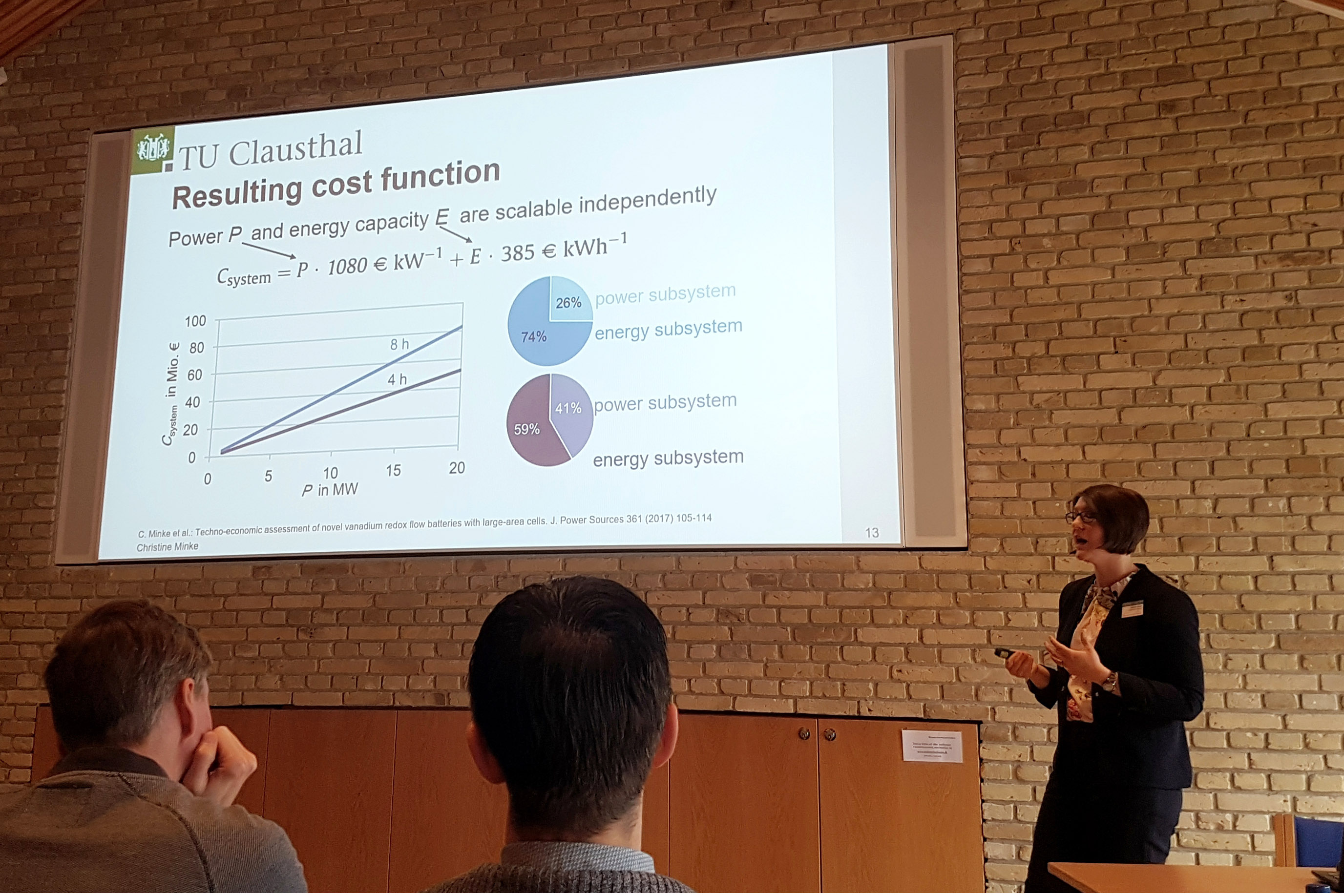 Dr. Christine Minke hielt einen Plenarvortrag zum aktuellen Stand der Kosten- und Nachhaltigkeitsbewertung von Vanadium-Redox-Flow-Batterien. „Dieser Batterietyp ist technisch so weit entwickelt, dass er bereits kommerziell angeboten wird. Gleichzeitig forschen wir mit Hochdruck an einem Scale-up der Technologie in den Megawattbereich, Kostensenkungspotenzialen und Recyclingoptionen“, fasst Dr. Minke die Forschungsarbeiten am EST zusammen, die vom Fachpublikum mit großem Interesse aufgenommen wurden. In der anschließenden Podiumsdiskussion beantwortete die junge Forscherin gemeinsam mit dem renommierten Experten für organische Elektrolyte, Professor Michael J. Aziz, Universität Harvard, Fragen zur künftigen Weiterentwicklung der Redox-Flow-Batterietechnologie.