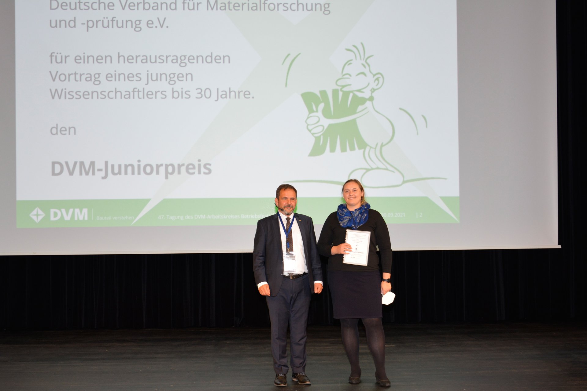 Auf der 47. Tagung des Arbeitskreises Betriebsfestigkeit des Deutschen Verbands für Materialforschung und -prüfung (DVM) wurde Dr. Michael Wächter für seine Verdienste auf dem Gebiet der Betriebsfestigkeit mit der DVM-Ehrennadel in Silber ausgezeichnet. Gleichzeitig erhielt Winniefred Rudorffer für ihren Fachvortrag den DVM-Juniorpreis.