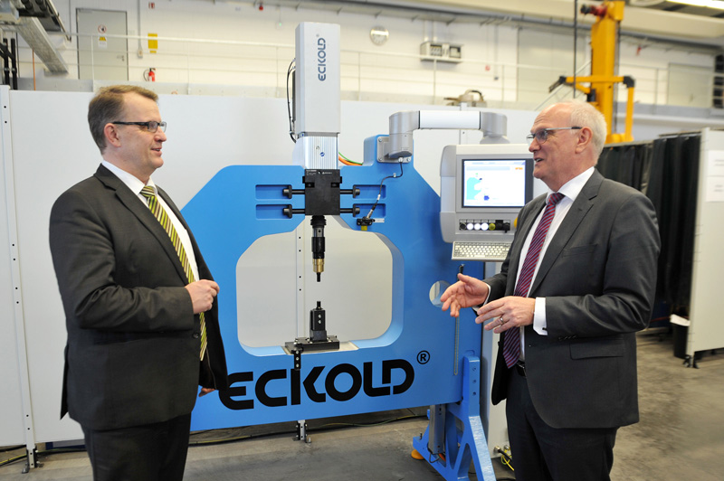 „Es handelt sich um eine Clinch- und Stanznietmaschine, die unser Anlagenportfolio auf dem Gebiet der wärmelosen Fügeverfahren abrundet“, erläuterte Professor Volker Wesling, Vorstandssprecher des CZM. Innerhalb werkstoffbezogener Forschung sei bereits ein Vorhaben der Eckold GmbH & Co KG mit der TU Clausthal sowie einer weiteren Universität, der TU Chemnitz, in Planung, bestätigte Dr. Rainer Beyer, der Geschäftsführer des Unternehmens. Die neue Anlage, die eine Ergänzung zum Punktschweißen darstellt, ist nach einer Schulung des CZM-Personals inzwischen einsatzbereit. Finanziert wurde das Gerät aus Drittmitteln und durch Sponsoring.