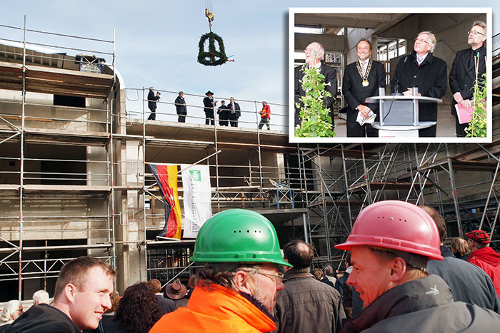 Rund 170 Gäste aus Wissenschaft, Wirtschaft, Handwerk und Politik waren im Feldgrabengebiet der Technischen Universität Clausthal dabei, als der Finanzminister das Signal zum Setzen der Richtkrone gab. In seiner Ansprache stellte Möllring anschließend die wachsende Bedeutung modernster Werkstoffe und Materialien heraus, wie sie künftig im CZM entwickelt werden.
