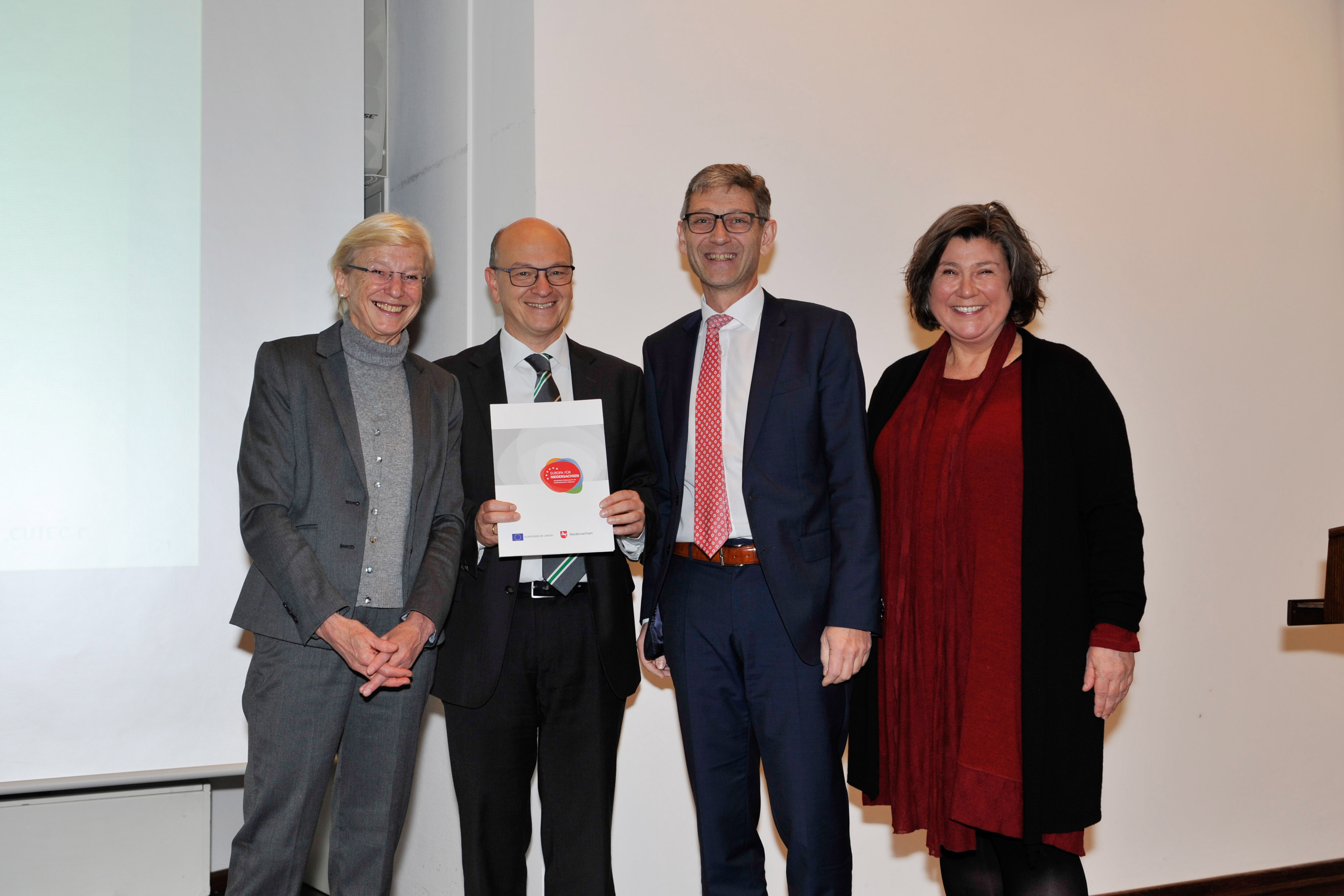 Bewilligungsbescheid übergeben (von links): Dr. Sabine Johannsen, Staatssekretärin im Niedersächsischen Wissenschaftsministerium, Professor Daniel Goldmann (CUTEC-Vorstandsvorsitzender), Professor Alfons Esderts (Vizepräsident der TU Clausthal für Forschung, Transfer und Internationales) sowie Irene Strebl, hauptberufliche Vizepräsidentin der Universität. Foto: Ernst