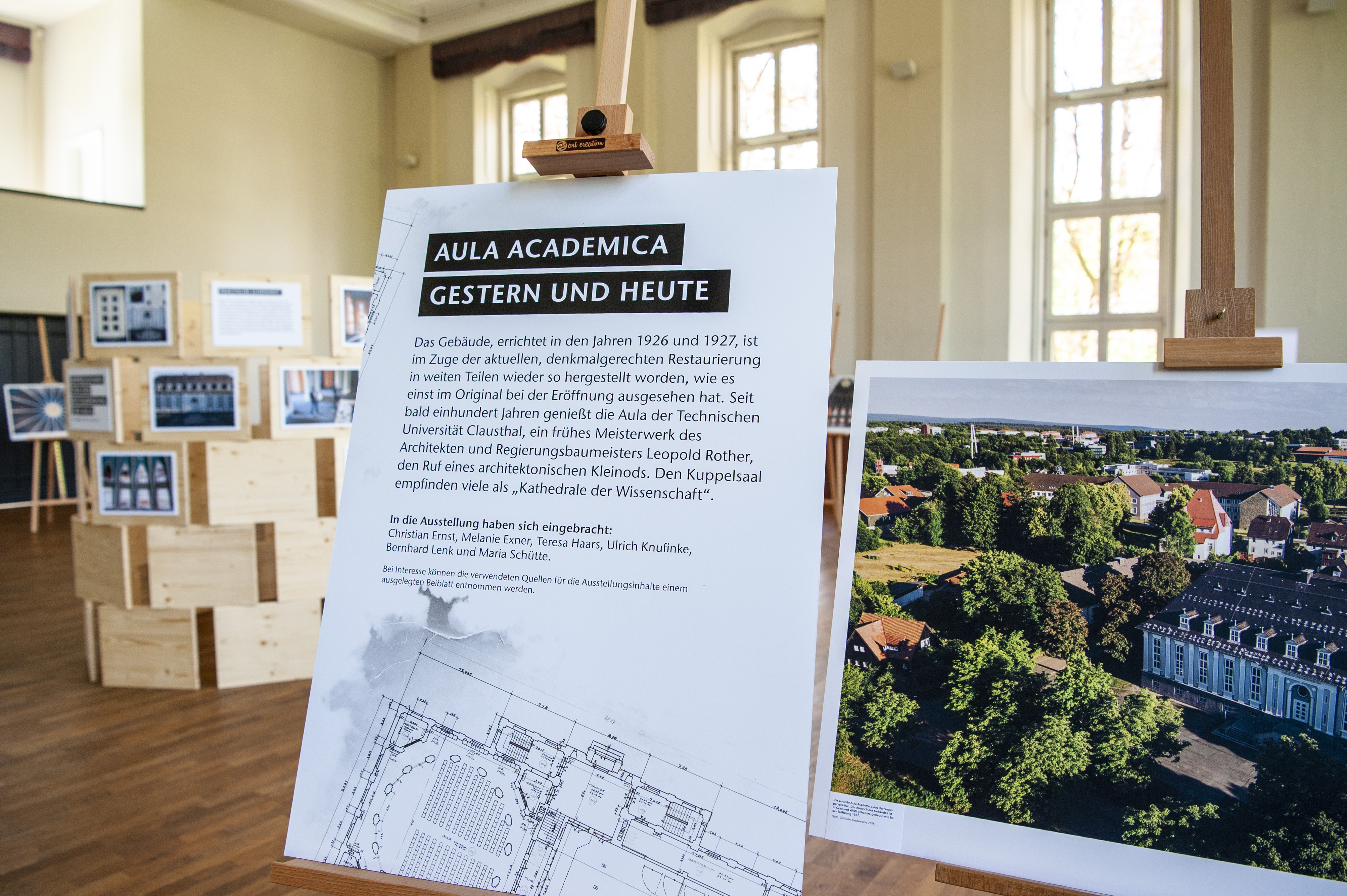 Im Rahmen der Ausstellung sind historische Fotos und Bauzeichnungen sowie Bilder der aktuellen Sanierung zu sehen. Aus heutiger Sicht ist es schwer vorstellbar, dass mitten im Plenumssaal der Aula früher ein Boxring zur Leibesertüchtigung der Studierenden stand und auch eine Schwimmhalle mit dem Gebäude verbunden war. Neben Bilddokumenten werden Exponate gezeigt und erläutert, beispielsweise das hohe und niedrige Professorengestühl bzw. drei großflächige, handbemalte Seidentücher mit Motiven der bergmännischen Kultur, die über Jahrzehnte im Kuppelsaal von der Balustrade herabhingen. Die Aula Academica, 1927 vornehmlich nach den Plänen des Architekten und Regierungsbaumeisters Leopold Rother errichtet, gilt als architektonisches Kleinod.