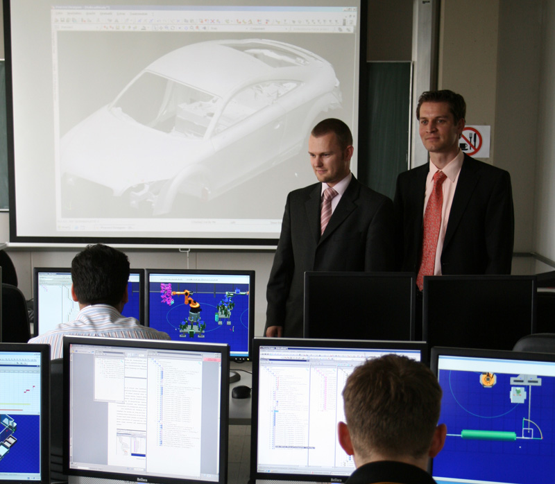 „Wird die 'Digitale Fabrik' frühzeitig eingesetzt, muss später in der Praxis deutlich weniger Zeit für die Optimierung der Fertigungsanlagen investiert werden“, sagt Christian Schlange, wissenschaftlicher Mitarbeiter am IMAB. Der Diplom-Informatiker betreut das Praktikum gemeinsam mit Dennis Arnhold. Der 28-jährige Informatikstudent der TU Clausthal hat im Rahmen seiner Diplomarbeit bei der Audi AG ein Handbuch für das Seminar geschrieben. Damit die Teilnehmer möglichst praxisnah und attraktiv an die „Digitale Fabrik“ herangeführt werden, haben die Autobauer digitale Fahrzeugproduktdaten des aktuellen Audi TT-Sportwagenmodells sowie digitale Varianten von Robotern und Maschinen zur Verfügung gestellt. Die Clausthaler Studenten kommen auf diese Weise frühzeitig mit einem möglichen und attraktiven Arbeitgeber in Kontakt.
