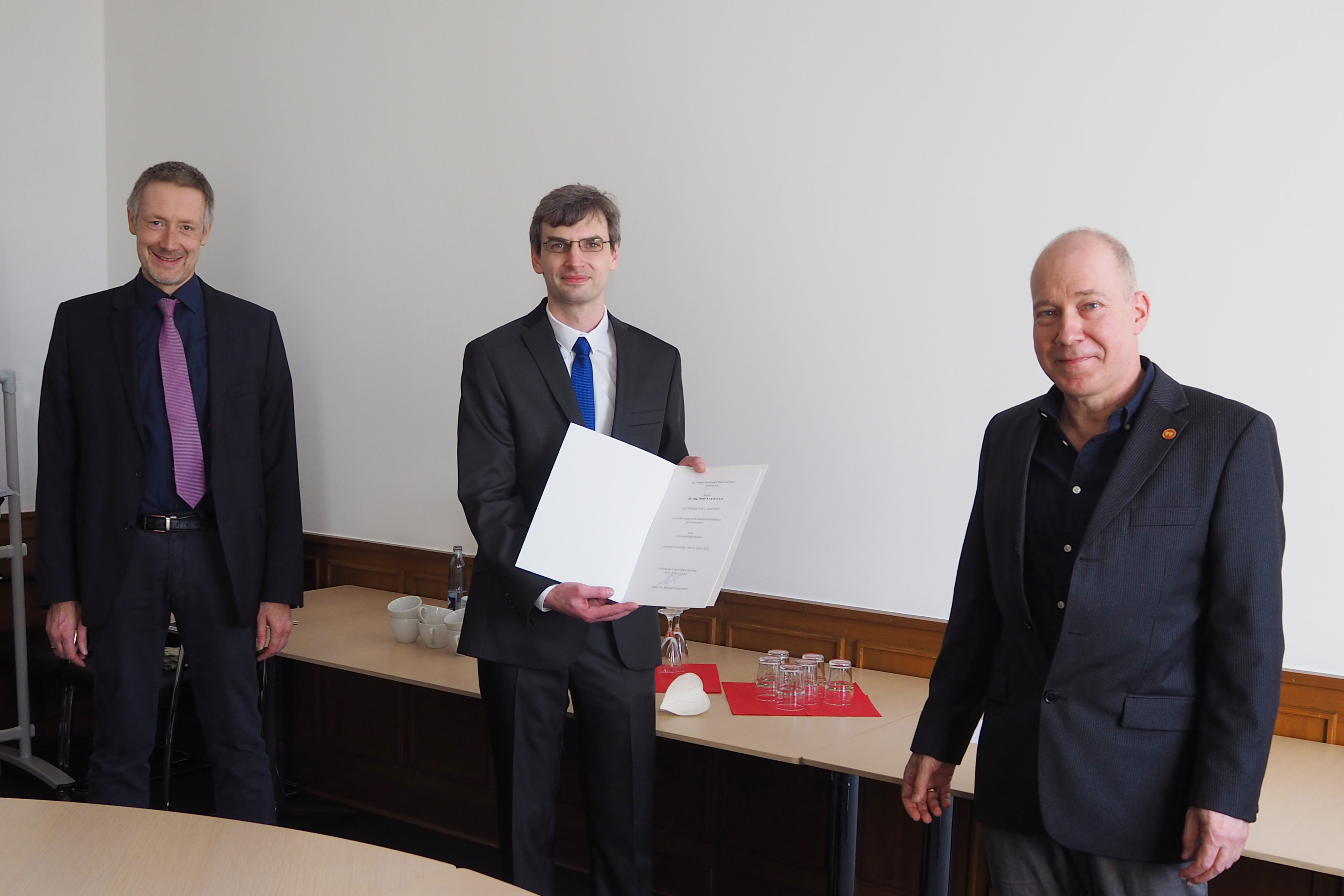 Dr. Niels Neumann (Mitte) ist an der TU Clausthal zum Universitätsprofessor ernannt worden. Institutsdirektor Prof. Christian Rembe (links) und Fakultätsdekan Prof. Jörg Müller waren bei der Ernennung, die TU-Präsident Prof. Joachim Schachtner per Videokonferenz durchführte, dabei. Foto: Nadine Kaiser