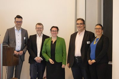 Die Referentinnen und Referenten beim Wasserstoff-Forum Südniedersachsen (von links): Christian Grascha (IHK Göttingen), Florian Renneberg (SüdniedersachsenStiftung), Universitätspräsidentin Dr.-Ing. Sylvia Schattauer, Dr. Daniel Tomowski, Staatssekretärin Anka Dobslaw. Foto: SüdniedersachsenStiftung.
