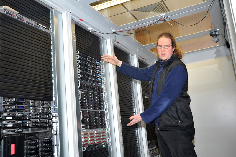 Christian Marg, Systemadministrator im Rechenzentrum, steht im Serverraum der Einrichtung. Fast alle Computer an der TU Clausthal, so berichtet er, greifen auf die in den Serverschränken steckende Technik zurück. Neben dem eigentlichen Nutzen - Webseiten wie www.tu-clausthal.de zum Abruf bereitzuhalten und (Forschungs-)Daten zu speichern oder zu verarbeiten - wird beinahe die komplette elektrische Energie, die die Server benötigen, in Wärme umgewandelt. Damit die Server trotzdem nicht überhitzen und im zulässigen Luftfeuchtigkeitsbereich arbeiten können, bedarf es einer umfangreichen Klimatisierung. „In diesem Bereich ließen sich in den vergangenen Jahren die Einsparungen realisieren“, erläutert Marg.