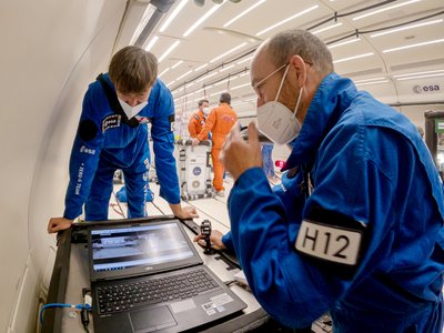 Die aktuellen Flüge fanden in der vergangenen Woche statt. Im Rahmen eines innovativen Forschungsprojektes mit dem Deutschen Zentrum für Luft- und Raumfahrt setzte Professor Günster dabei eine Versuchsreihe zum Thema additive Fertigungsverfahren bzw. 3D-Druck in der Schwerelosigkeit fort. Mit an Bord war nicht nur wieder ein Drucker, der von der Clausthaler Firma DHM Prüfsysteme hergestellt wurde. Mit an Bord war dieses Mal auch der Inhaber des Unternehmens, Dr. Harald Müller, ein Alumnus der TU Clausthal.