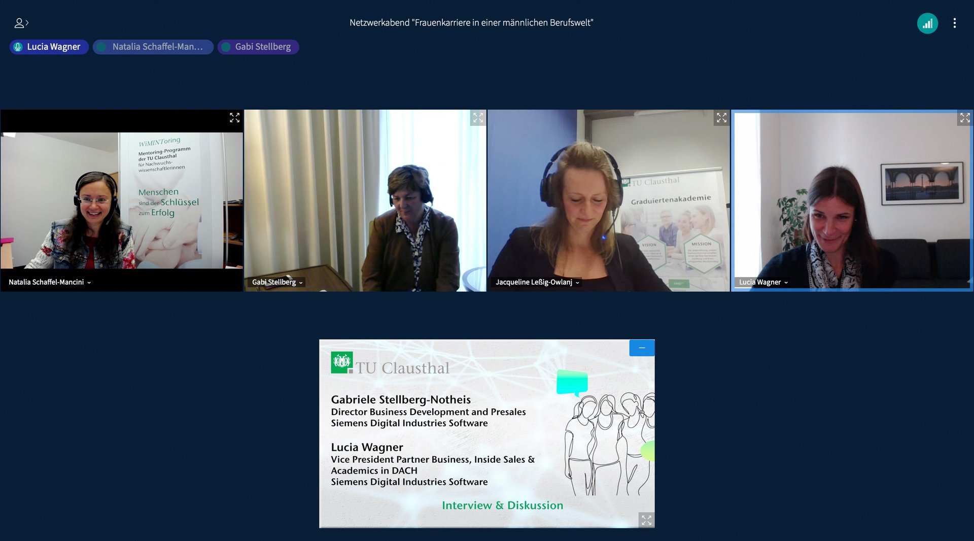 Für den Netzwerkabend konnten zwei inspirierende Referentinnen aus dem Unternehmen Siemens Digital Industries Software gewonnen werden: Gabriele Stellberg-Notheis und Lucia Wagner. Sie teilten ihre Erfahrungen mit rund 30 (Nachwuchs-)Wissenschaftlerinnen der TU Clausthal. Durch den Abend führten Dr. Natalia Schaffel-Mancini, hauptberufliche Gleichstellungsbeauftragte der Universität, sowie Dr. Jacqueline Lessig-Owlanj, Geschäftsführerin der Graduiertenakademie.
