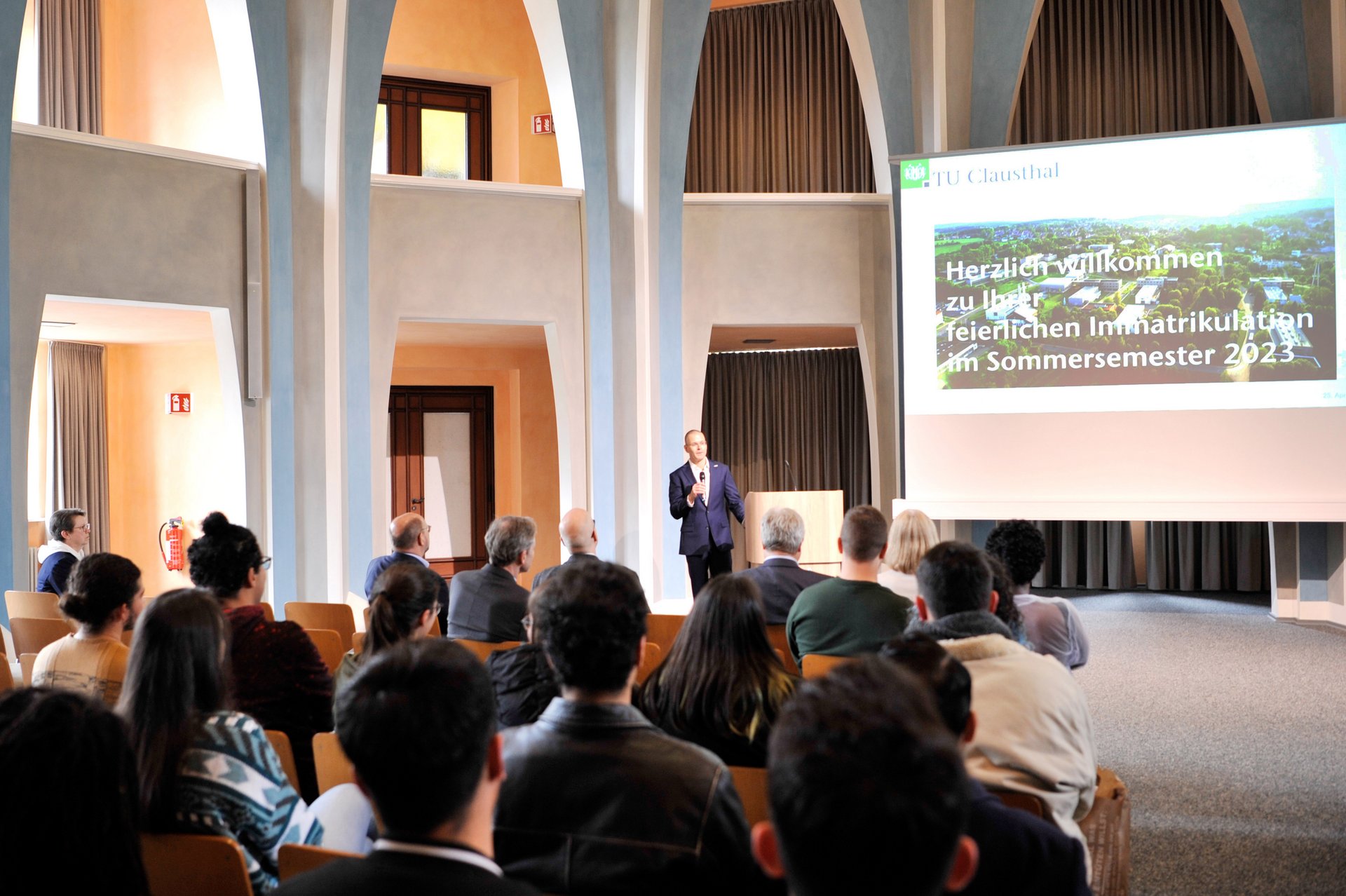 Die neuen Studierenden sind der TU Clausthal sehr wichtig. Dies hat die feierliche Immatrikulation in der Aula Academica gezeigt. Die Präsidentin, der Vizepräsident für Studium und Lehre, der Vorsitzende des Vereins von Freunden der Universität (VvF) und weitere Personen in leitender Funktion hießen die neuen Studierenden persönlich, authentisch und zweisprachig willkommen.