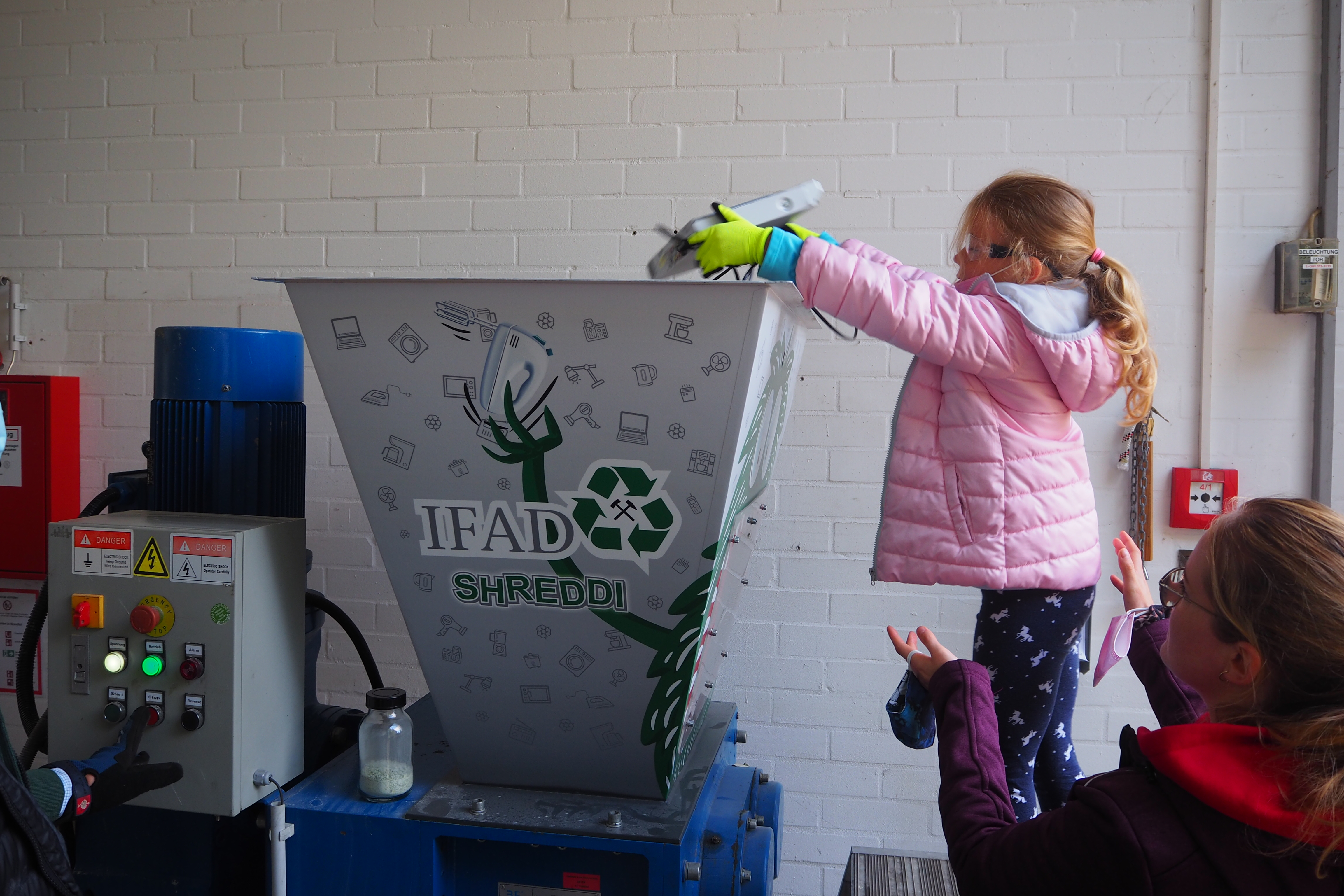 Am Institut für Aufbereitung, Deponietechnik und Geomechanik (IFAD) fand mit dem Team rund um Jasmin Hoff (IFAD) eine Aktion zum Thema Recycling statt. Neben der Gewinnung von Elementen wie Eisen und Kupfer aus einem vorbereiteten Sand stieß besonders das Schreddern der mitgebrachten Altgeräte auf Begeisterung. Aber nicht nur das erwartete die Kinder: Im Super Lab wurde gemeinsam mit Petra Lassen vom Institut für anorganische und analytische Chemie an Lebensmitteln experimentiert, und mit Kinderbuchautorin Nicole Schaa durften die Mädchen und Jungen den Wald erleben und entdecken. Den Abschluss der Woche machte eine von Angela Binder vom Institut für Bergbau organisierte Erlebnisvorlesung. Dort lernten die Teilnehmenden, inwiefern das alltägliche Leben von Rohstoffen, wie zum Beispiel Salz, geprägt ist. Danach konnten sie in kleinen Gruppen mit Kameras und Drohne ausgestattet ihr Wissen zum Oberharzer Wasserregal vertiefen und weitergeben.