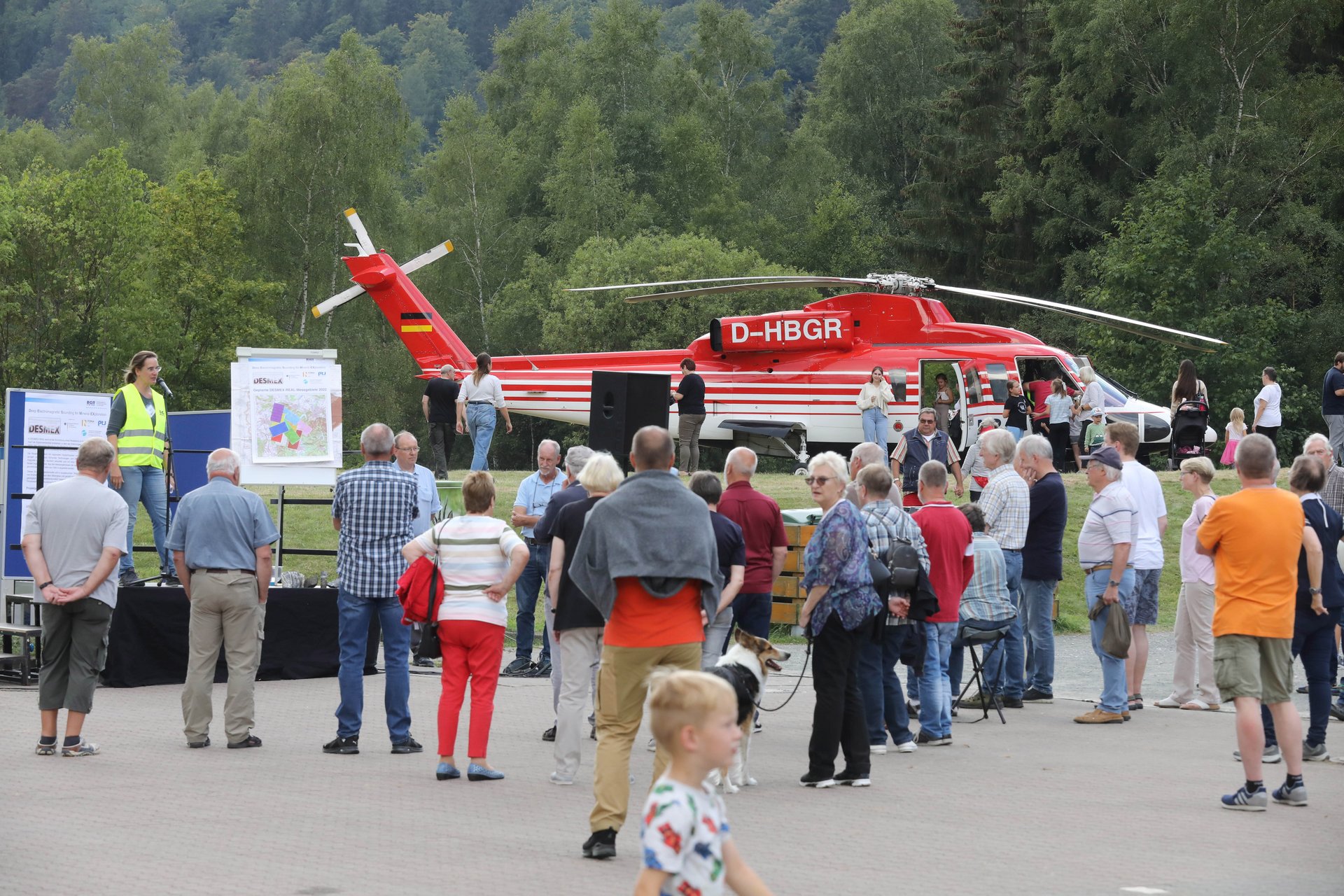 Ein Hubschrauber der Bundesanstalt für Geowissenschaften und Rohstoffe (BGR) überfliegt im September zur geophysikalischen Erkundung den Oberharz. Im Rahmen einer öffentlichen Informationsveranstaltung in Lautenthal (siehe auch Bilder unten) konnten Interessierte den Hubschrauber zuvor am Boden besichtigen. Auch eine Schleppsonde und weitere Messtechnik wurden gezeigt. Fotos: André Bertram