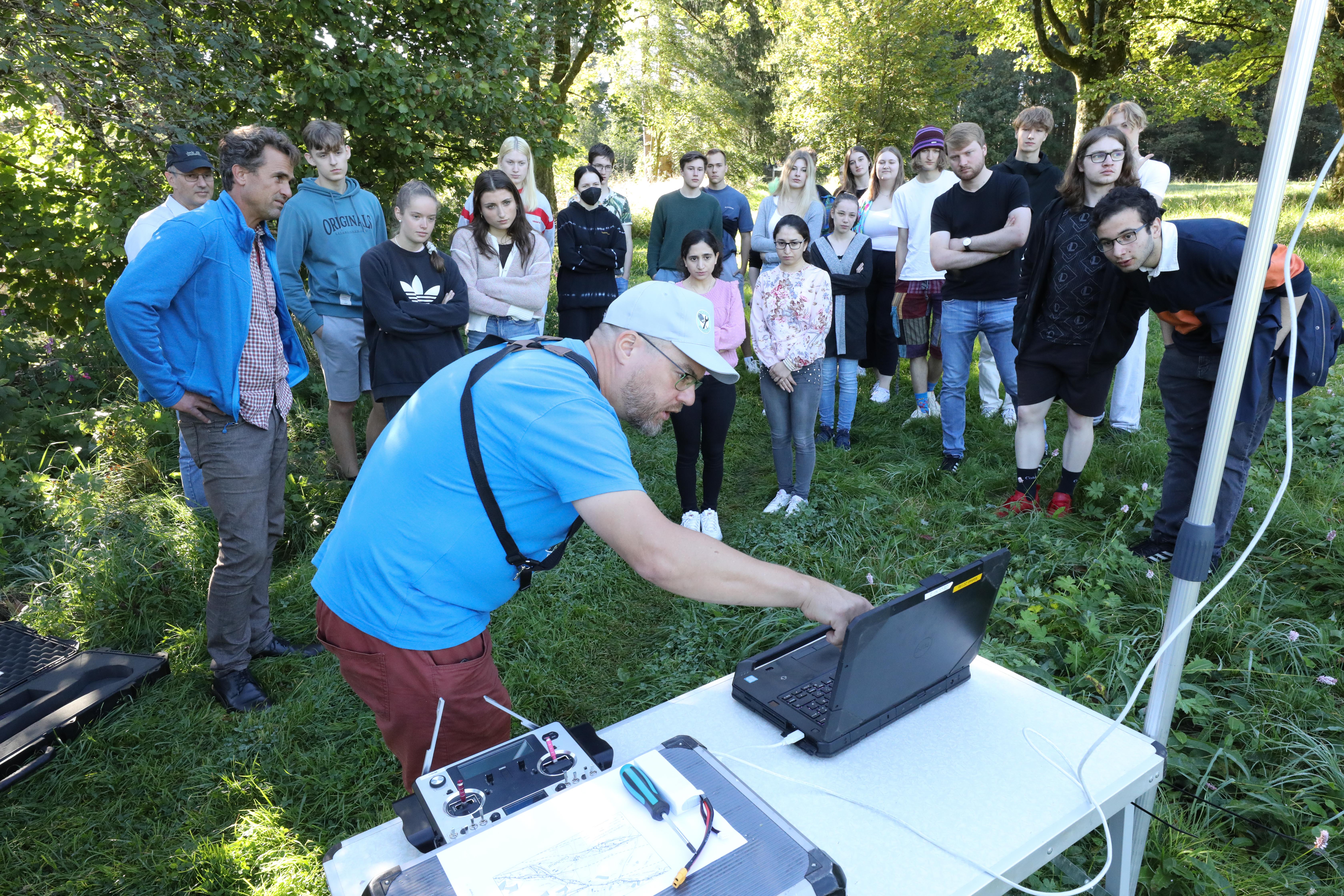 Die Veranstaltung im Gymnasium hatte Andre Bertram vom Clausthaler Umwelttechnik-Forschungszentrum (CUTEC) der TU Clausthal initiiert und organisiert. Er fungiert unter dem Aspekt „Lokale Netzwerke“ als Ansprechpartner im Oberharz für die zahlreichen beteiligten Projektpartner. Neben der BGR, der Universität Münster und der TU Clausthal sind es sieben weitere Einrichtungen. Um den Schülerinnen und Schülern der RKS einen Eindruck von den Erkundungsflügen zu vermitteln, steuerte Drohnenpilot Stefan Klingen (Universität Münster) eine mit einem Magnetfeldsensor im Schleppkörper ausgestattete14-Kilogramm-Drohne über eine Wiese im Wald nahe der Schule. Die Jugendlichen erfuhren nach Auswertung der Daten, wie viele Störfelder sich stadtnah im Untergrund befinden. Als der Projektleiter ein Stück Eisen auf der Wiese platzierte, war auch diese Anomalie und ihre Lage deutlich sichtbar. Für die Schülerinnen und Schüler waren es drei spannende Unterrichtstunden, in denen sie modernste geophysikalische Messmethoden theoretisch und praktisch vermittelt bekamen. (Der Beitrag ist mit Unterstützung der Goslarschen Zeitung entstanden)