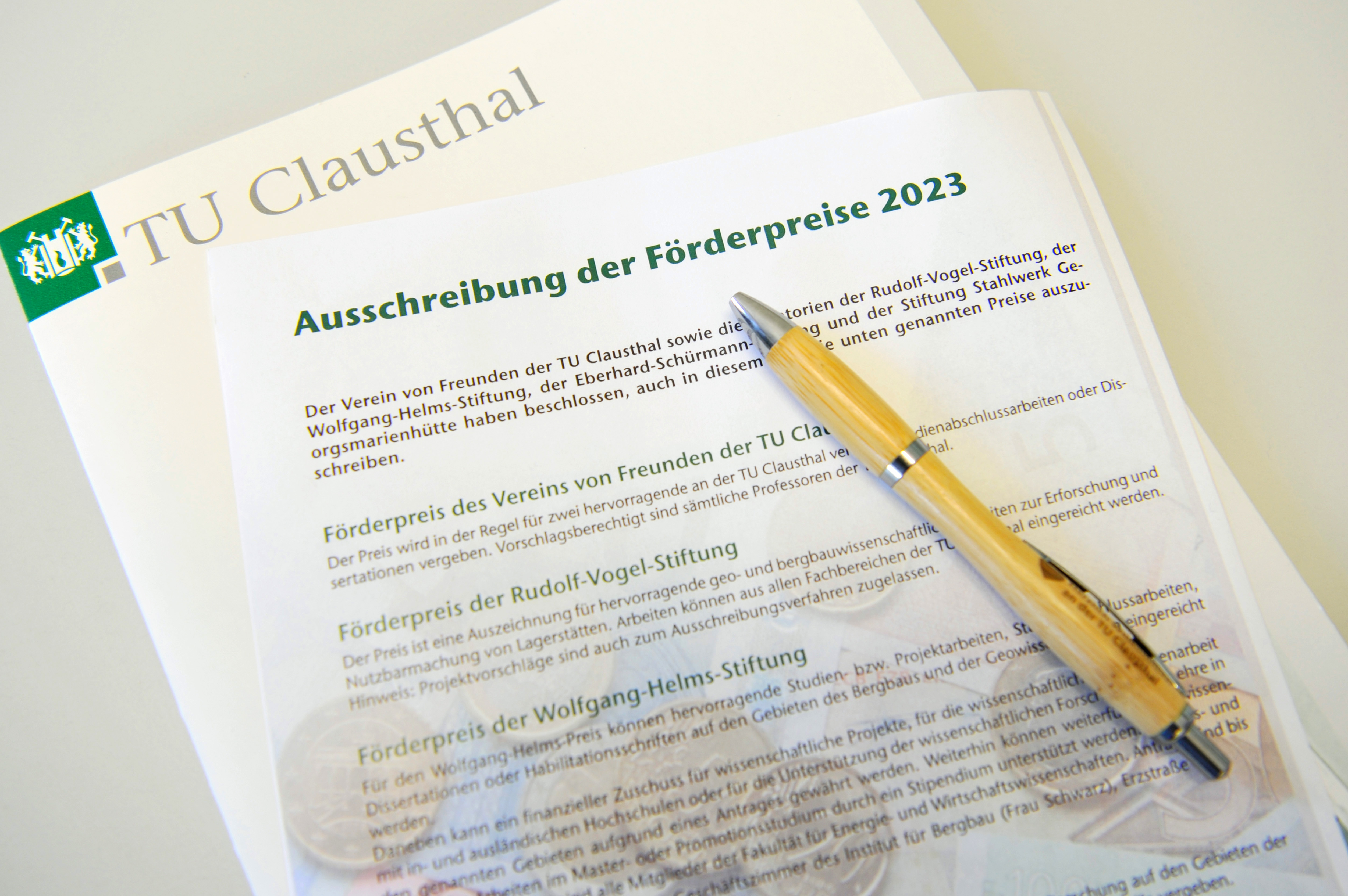 Deshalb schreiben der Verein von Freunden der TU Clausthal sowie die Kuratorien der Rudolf-Vogel-Stiftung, der Wolfgang-Helms-Stiftung, der Eberhard-Schürmann-Stiftung und der Stiftung Stahlwerk Georgsmarienhütte auch in diesem Jahr Förderpreise aus. Anmeldeformulare und Teilnahmebestimmungen sind bei den Professorinnen und Professoren sowie in den Geschäftszimmern der TU-Institute erhältlich. Die Arbeiten sind – falls nicht anders angegeben – bis zum 7. Juli in der Geschäftsstelle des Vereins von Freunden (Aulastraße 8) einzureichen.