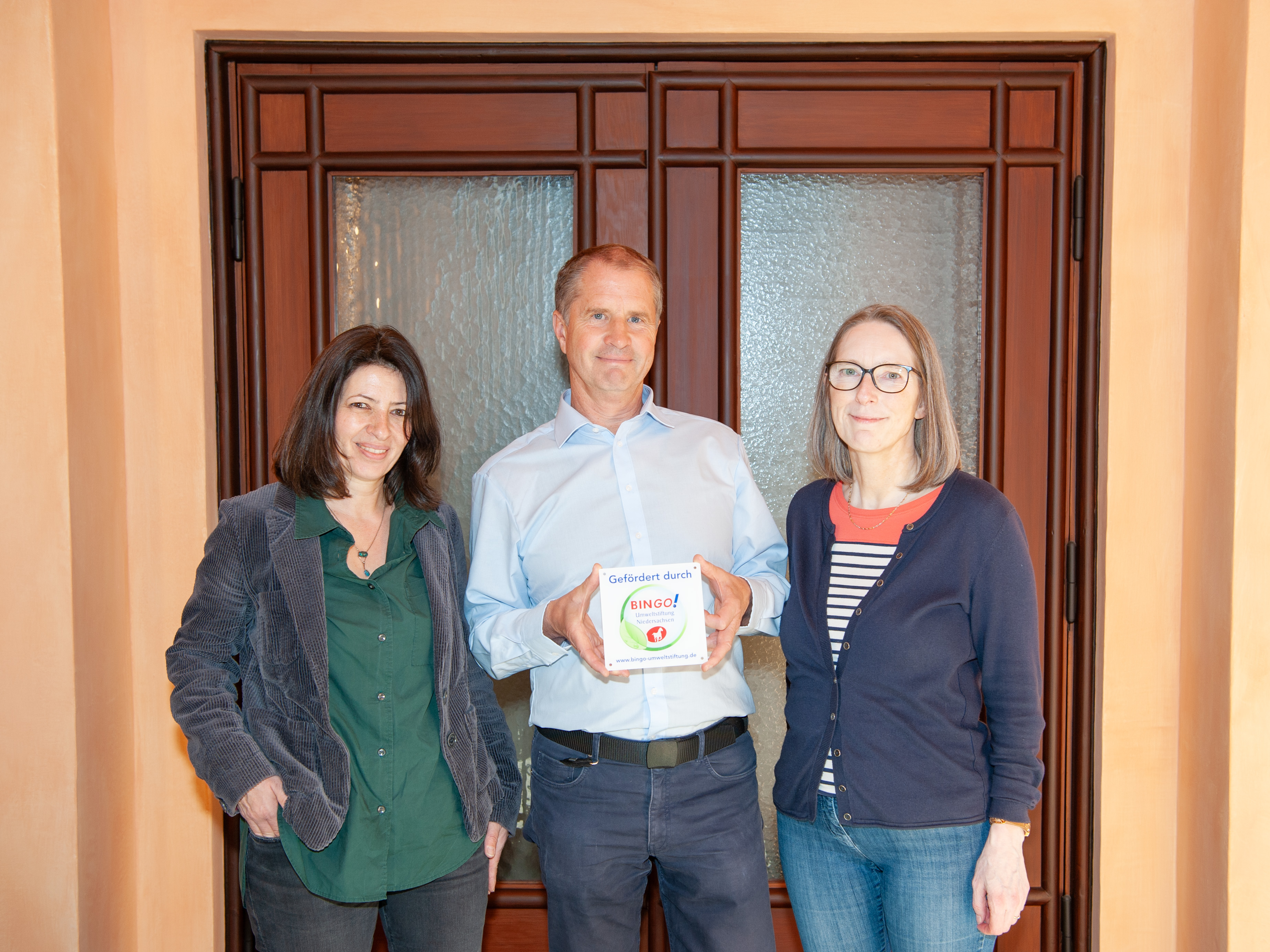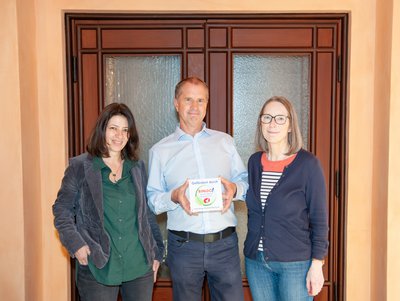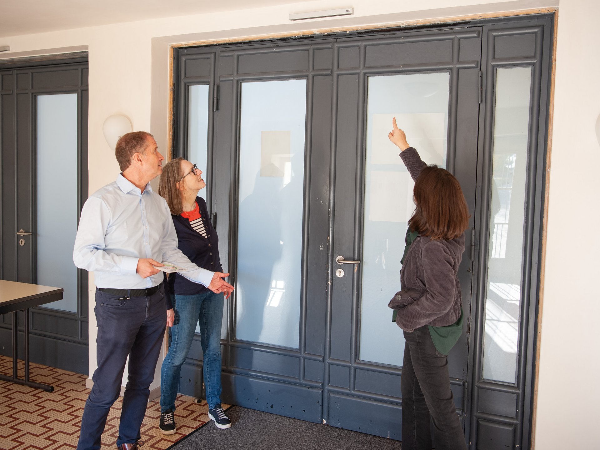 Die Historikerin Dr. Nadja Wischmeyer und Joachim Mertens, Leiter des Technischen Verwaltung der TU Clausthal, freuen sich gemeinsam mit Maria Schütte vom Aula-Management über den anstehenden „Bauwinter“. Nach den aufwändigen Sanierungsarbeiten zwischen 2019 und 2022, durch die die Aula heute wieder in ihren Originalfarben erstrahlt, werden nun auch die Innentüren im Erdgeschoss restauriert. „Für die großzügige Unterstützung der Niedersächsische Bingo-Umweltstiftung sind wir sehr dankbar“, sind sich die drei einig.
