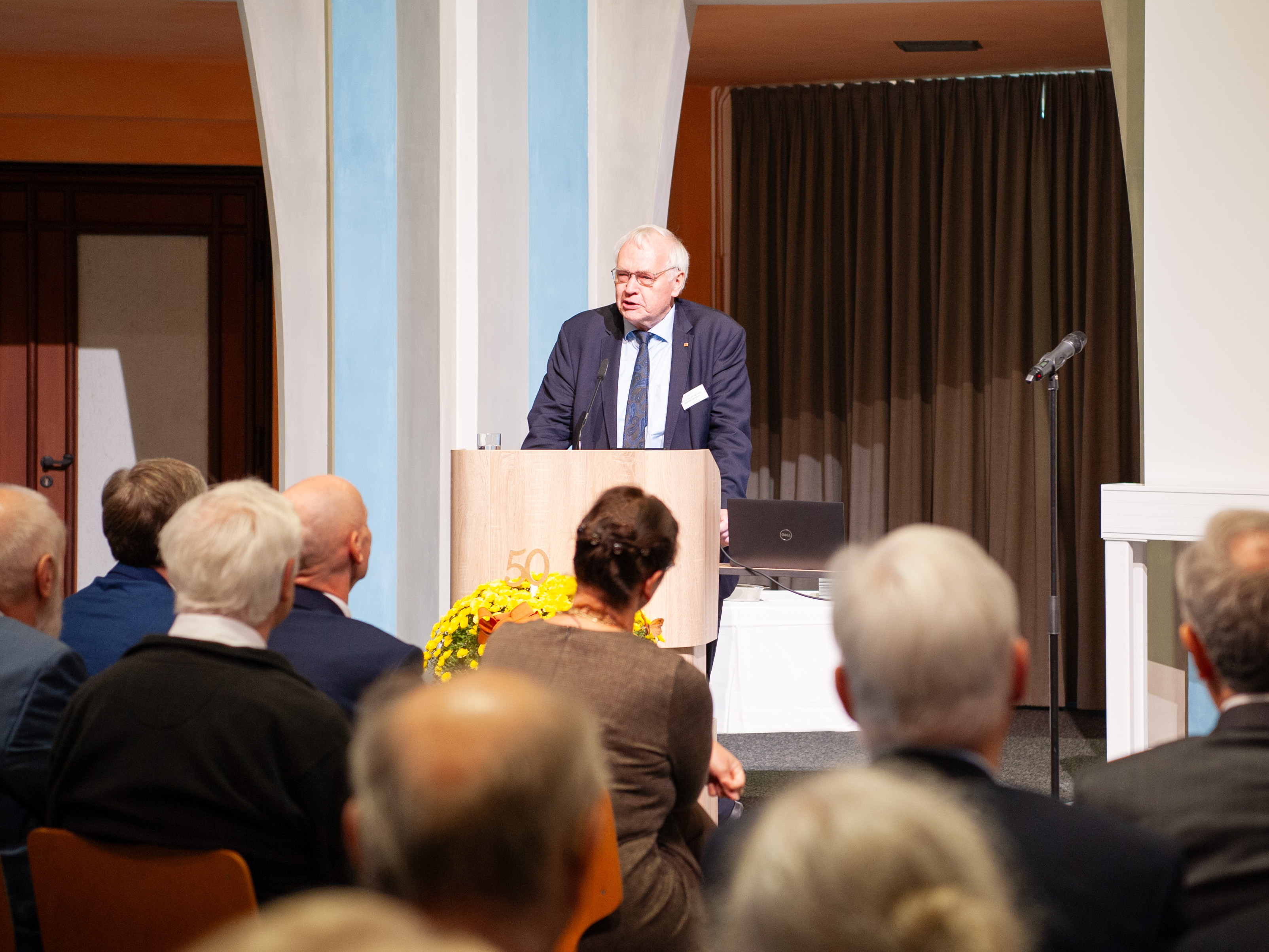 Von nah und fern waren die Jubilarinnen und Jubilare angereist, um an ihrer Alma Mater erneut ein Diplom entgegenzunehmen. „Soweit ich weiß, müssen wir dafür aber keine Prüfung ablegen“, scherzte der Diplomand Prof. Manfred Hennecke in seiner Jahrgangsrede. Viele schöne Erinnerungen verbinde er mit seinem Studienort: ein Kino und eine Disko im Ort, hohe Schneeberge und die Anreise mit dem Zug direkt zum örtlichen Bahnhof. Als studentisches Mitglied habe er sich im Allgemeinen Studierendenausschuss und Senat engagiert. Mit Blick auf den 250. Geburtstag der Universität im kommenden Jahr zog er scherzhaft eine Parallele: „Ich war Mitglied der Kommission zur 200-Jahrfeier. Damals spielte eine Band namens ,Meyer‘s Dampfkapelle‘. Wir können das Spektakel dann ja vergleichen.“