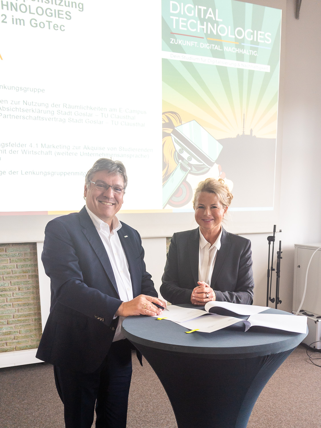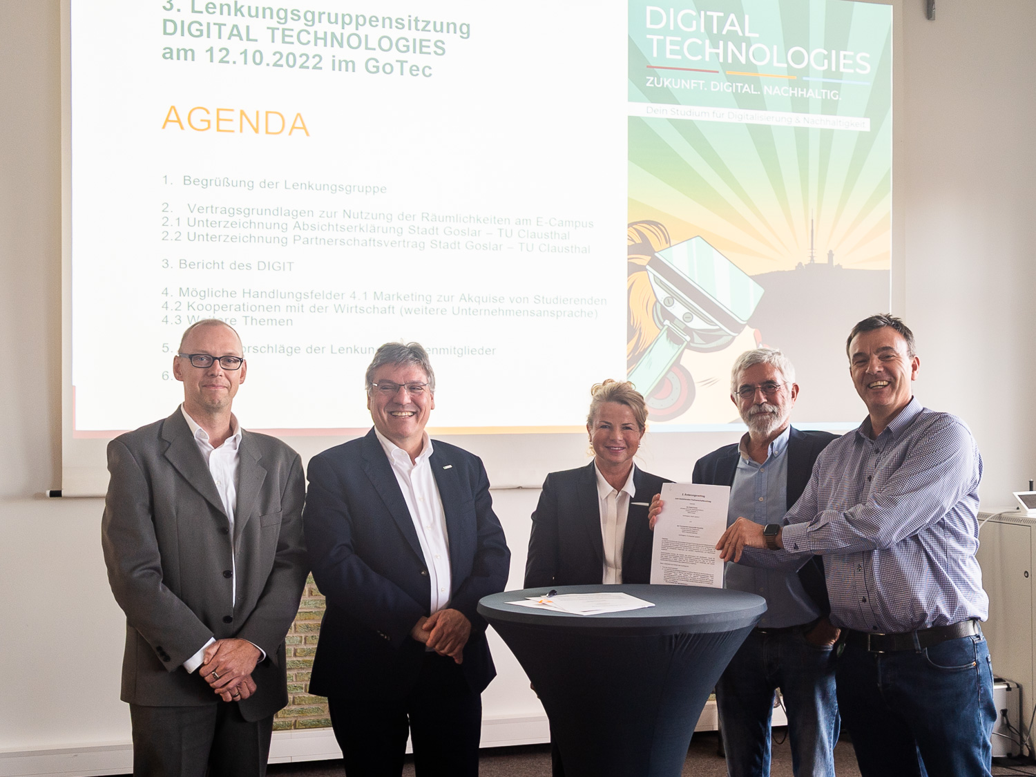 Am Mittwoch, 12. Oktober 2022, unterzeichneten die Goslarer Oberbürgermeisterin Urte Schwerdtner und der Präsident der TU Clausthal Prof. Dr. Joachim Schachtner am Rahmen der 3. Lenkungsgruppensitzung Digital Technologies die Absichtserklärung zur Verstetigung des Studiengangs am Energie-Campus Goslar. Mit der Unterzeichnung ist die Grundlage für die Etablierung der Stadt Goslar als Studienort des gemeinsamen Studienprogramms der Ostfalia Hochschule und Technischen Universität Clausthal Digital Technologies geschaffen. Prof. Dr. Joachim Schachtner: „Ich freue mich, dass wir an dieser Stelle mit der Stadt Goslar so unkompliziert zusammenarbeiten und das GoTEC-Tagungszentrum nutzen können. Für den Studiengang Digital Technologies, ein gemeinsamer Studiengang der TU Clausthal mit der Ostfalia Hochschule in Wolfenbüttel, ist Goslar als Standort in der Mitte ideal. Diese Konstellation schafft einen Mehrwert für alle Beteiligten: die TU Clausthal, die Stadt Goslar, die Ostfalia und natürlich die Studierenden, die sich in dem innovativen Studiengang mit hohem Projektanteil einschreiben.“