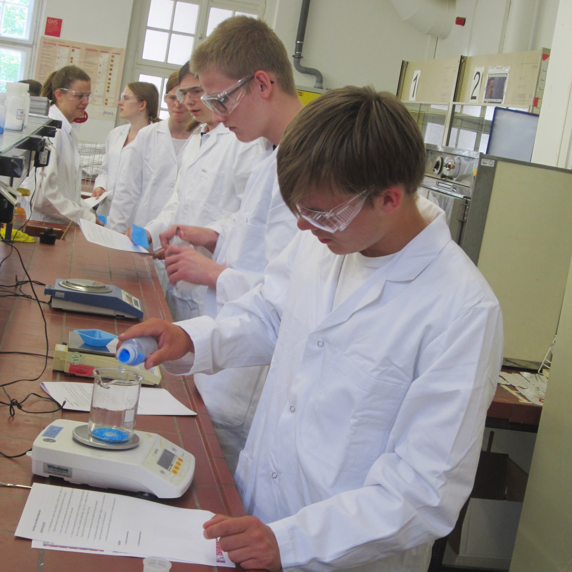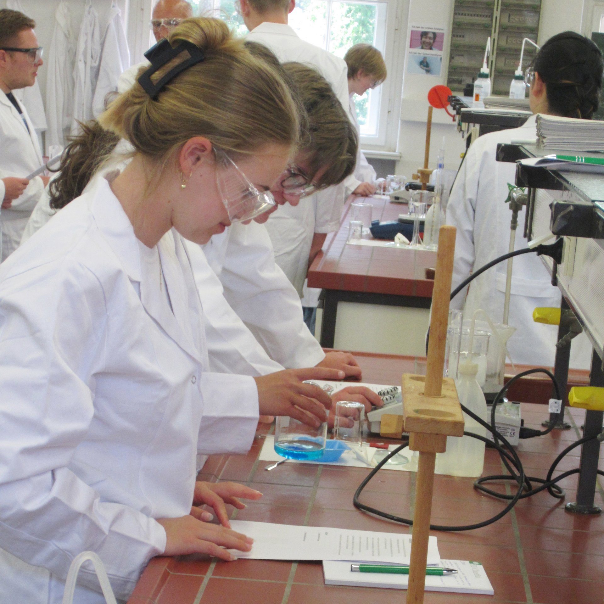 Nach der Einführungsvorlesung standen für die Schüler:innen zunächst experimentelle Arbeiten im großen Praktikumssaal auf dem Programm. In weißen Kitteln und mit Schutzbrillen führten sie akribisch Versuche zur Anorganischen Chemie durch. Den Abschluss des ersten Tages bildete der Besuch des Bergbauernmarktes in Clausthal-Zellerfeld. Tags darauf folgten zunächst zwei Unternehmensbesichtigungen: von Albemarle, ein Produzent von Lithiumverbindungen, in Langelsheim und von H.C. Starck Tungsten Powders, ein Anbieter von Wolframprodukten, in Goslar. Wieder zurück an der Uni, widmete sich die Gruppe Aufgaben aus der Organischen Chemie. Zur Stärkung wurde am Abend gemeinsam gegrillt, sowohl fleischhaltig als auch fleischlos. Am dritten Tag rundeten dann Themen aus der Physikalischen Chemie den Lehrinhalt ab.