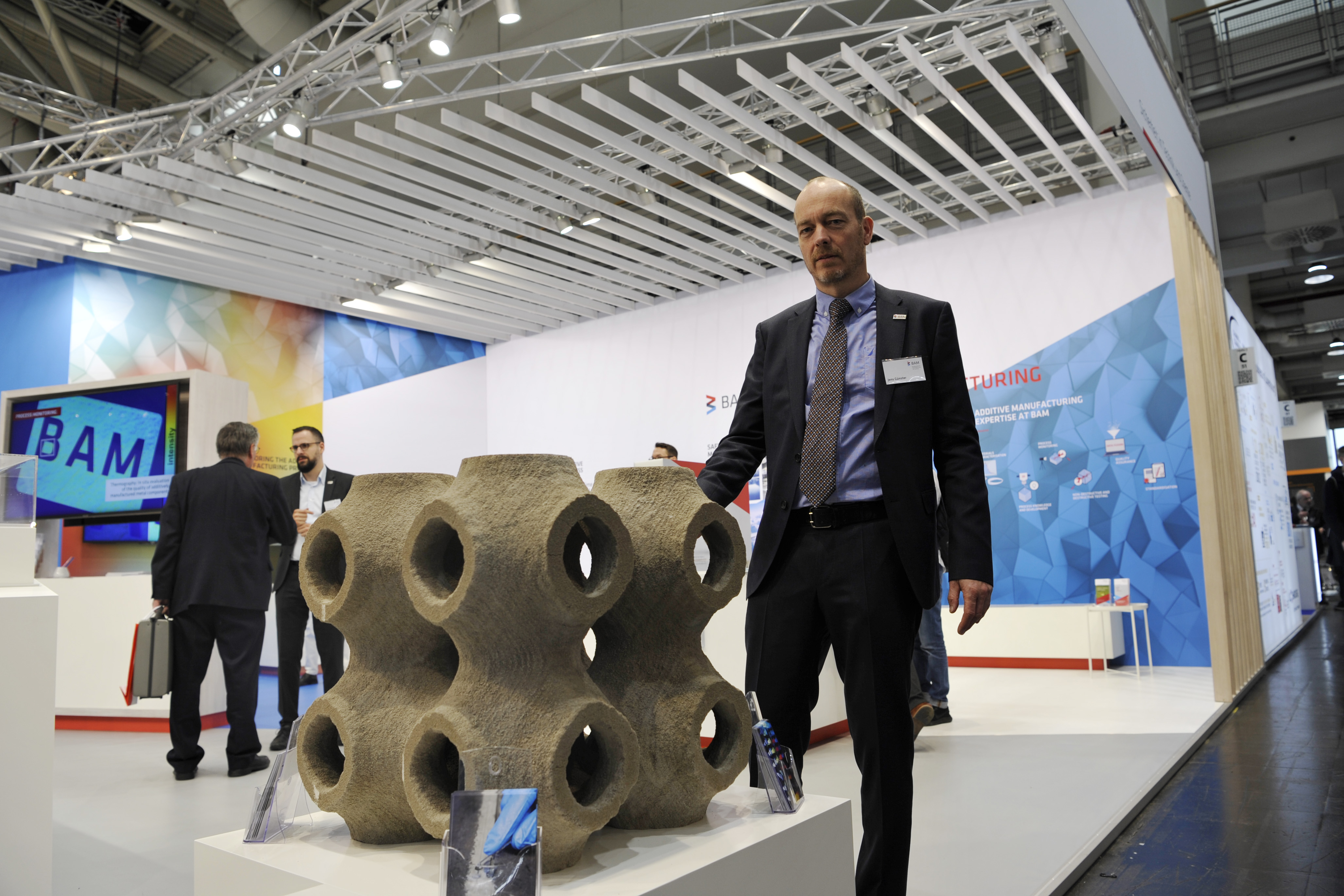 Das Exponat am Stand C 51 ist ein echter Hingucker. So groß wie ein Sitzwürfel mit 60 Zentimetern Kantenlänge, fällt die Struktur mit vier kreisrunden Öffnungen an jeder Seite sofort ins Auge. „Das ist ein sehr stabiles Bauteil aus Beton, das innerhalb von 30 Minuten mit additiver Fertigung, also im 3D-Druck-Verfahren, hergestellt worden ist“, erläutert Professor Jens Günster. Der Wissenschaftler nimmt eine Doppelfunktion wahr. An der TU Clausthal ist er Professor für Hochleistungskeramik und an der Bundesanstalt für Materialforschung und -prüfung (BAM) leitet er den Fachbereich Keramische Prozesstechnik und Biowerkstoffe. In Kooperation forscht sein Team an laser-basierter additiver Fertigung von alkali-aktiviertem Beton. Dieser hat nicht nur eine höhere chemische Resistenz, sondern bietet in Kombination mit der 3D-Drucktechnologie einzigartige Möglichkeiten für Industrieanwendungen, zum Beispiel für Spezialanfertigungen oder Kleinserien von Beton-Bauteilen zu überschaubaren Kosten. „Die additive Fertigung wird bereits mit großem Erfolg für Kunststoffe und Metalle eingesetzt“, so Professor Günster, „wir wollen den Fertigungsprozess weiterentwickeln, so dass er auch im Baustoffbereich sicher angewendet werden kann.“ Das Thema kommt an, sogar Messegäste aus Dubai haben schon intensiv nachgefragt.