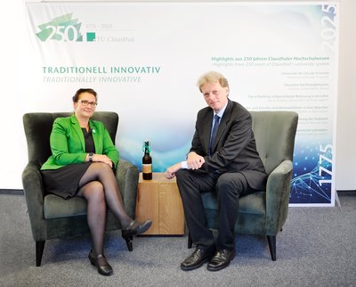 Freuen sich auf eine gemeinsame Zusammenarbeit: die Clausthaler Universitätspräsidentin Dr.-Ing. Sylvia Schattauer und Dr. Michael Müller-Bahns, der vom Senat zum neuen hauptberuflichen Vizepräsidenten gewählt worden ist. Als kleines Willkommensgeschenk gab es eine Flasche alkoholfreies Bier aus der Forschungsbrauerei der TU Clausthal. Foto: Christian Ernst