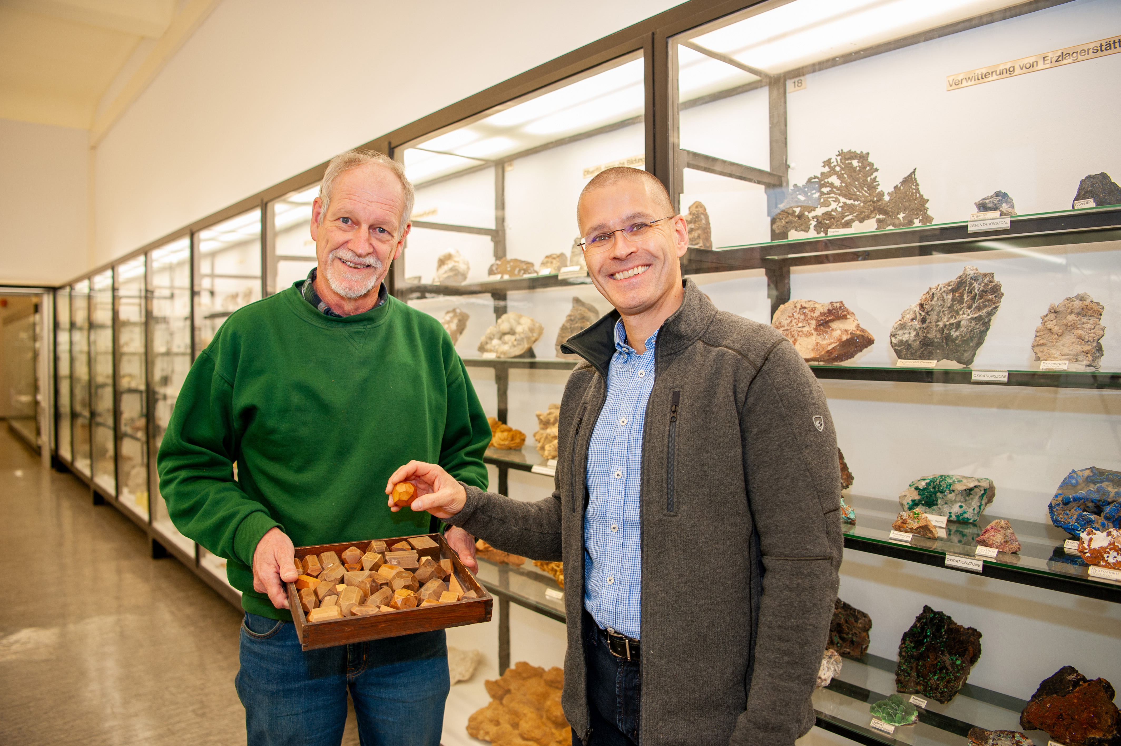 TU-Vizepräsident Prof. Christian Bohn (rechts) gibt das Holzmodell eines Kristalls an Dr. Wilfried Ließmann, den Kustos der Geosammlung der TU Clausthal, weiter. Nach 50 Jahren in der Fremde war das gute Stück von einem Alumnus an die Harzer Universität zurückgebracht und wieder in die Kiste mit den anderen Modellen der mineralogischen Lehrsammlung – siehe Foto unten – gelegt worden. Fotos: Sofia Dell‘Aquila