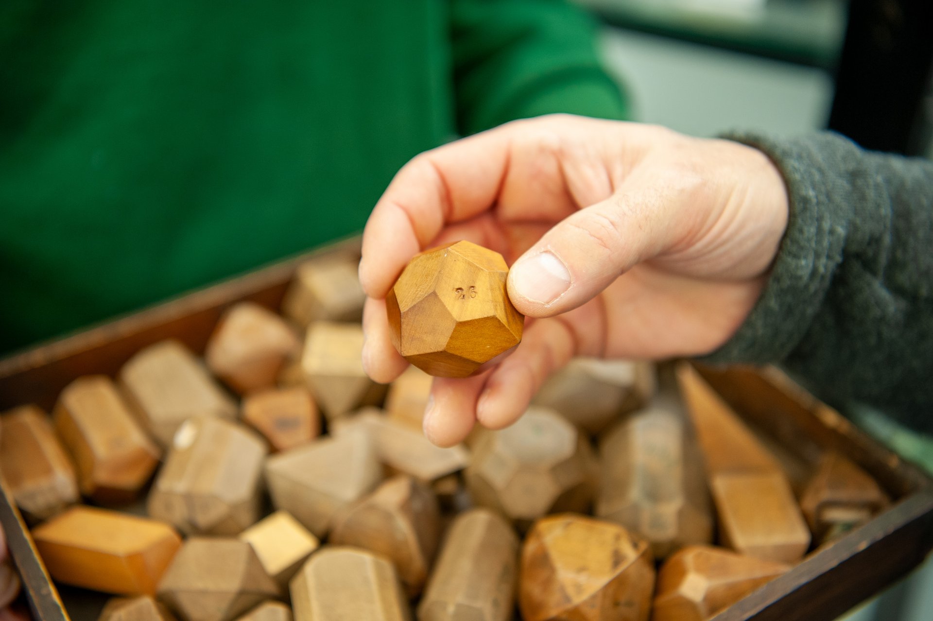 Damit alles wieder seine Richtigkeit hat, reichte Prof. Bohn das Holzmodell an die Clausthaler Mineralogen weiter, genauer gesagt an den Kustos der Geosammlung Dr. Wilfried Ließmann. Der Diplom-Mineraloge musste angesichts des Holzklötzchens gleich schmunzeln: „Das ist ein Pentagonikositetraeder, ein 24-Flächner, das ist schon ein schwieriges Modell. Ich hätte es für eine Prüfung eher nicht genommen.“