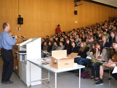 Nachdem die Gymnasiasten jeweils am Tag zuvor auf der Hannover Messe die Innovationen der Industriebranche besichtigt hatten, rundeten sie ihre Tour nach Norddeutschland bei herrlichem Wetter mit einem Besuch der Universität ab. „Wir zeigen Ihnen heute, wie Sie an die tollen Jobs kommen, die Sie gestern auf der Hannover Messe gesehen haben“, begrüßte Jochen Brinkmann, Leiter der Kontaktstelle Schule-Universität, die Jugendlichen im Audimax. Der größte Hörsaal der TU Clausthal war derart gefüllt, dass die Schüler sogar auf den Treppen sitzen mussten.