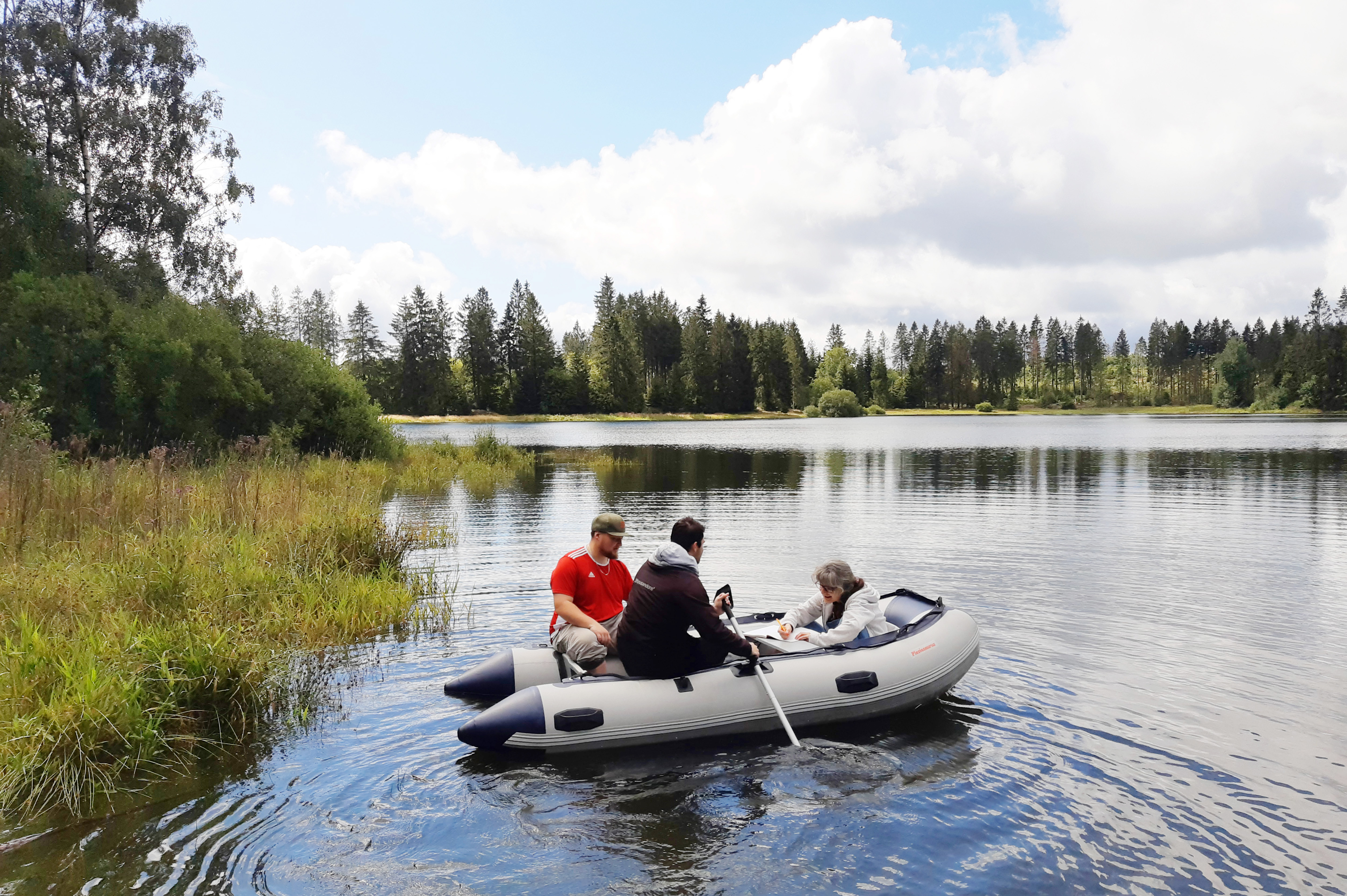 Bei der hydrogeologischen Exkursion kam auch das neu angeschaffte Schlauchboot des Instituts für Geologie und Paläontologie zum Einsatz. Probenahmen (siehe auch Bilder unten) fanden statt an der Eisenquelle südlich von Altenau, am Oderteich mit seinen Randmooren, am Innerstesprung bei Clausthal und am Kiefhölzer Teich nordöstlich von Zellerfeld. Fotos: Michael Schäfer