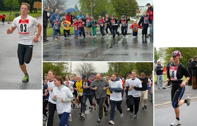 Trotzten den widrigen Bedingungen beim 17. TU-Campuslauf: Der Sieger der Leistungsklasse (LK) Männer, Konstantin Wachor (li.), die Kinder beim Bambinilauf (Mitte oben), die Erwachsenen Hobbyläufer und die Siegerin der LK Frauen Sabine Krumpen-Müller (re.).