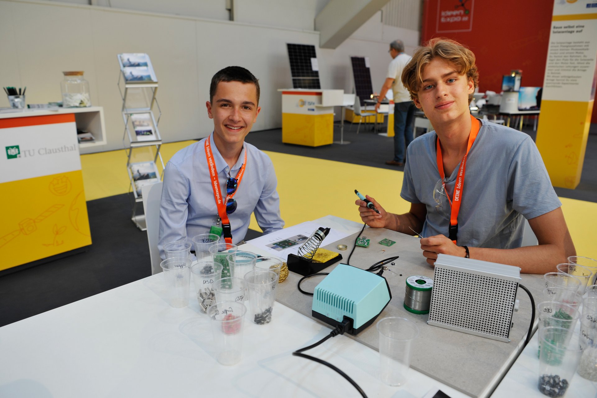 Universitätspräsident Prof. Joachim Schachtner besuchte das Team der TU Clausthal auf der IdeenExpo. Beim Experiment „Strom 2 go“ – siehe auch Bilder unten - können sich Schülerinnen und Schüler blinkende TU-Clausthal-Pins zusammenlöten. Auf dem Stand des DIGIT lernen Interessierte Künstliche Intelligenz im Workshop „Deep Driving“ kennen. Das gesamte Event hat das Motto „Mach doch einfach“. Fotos: Christian Ernst