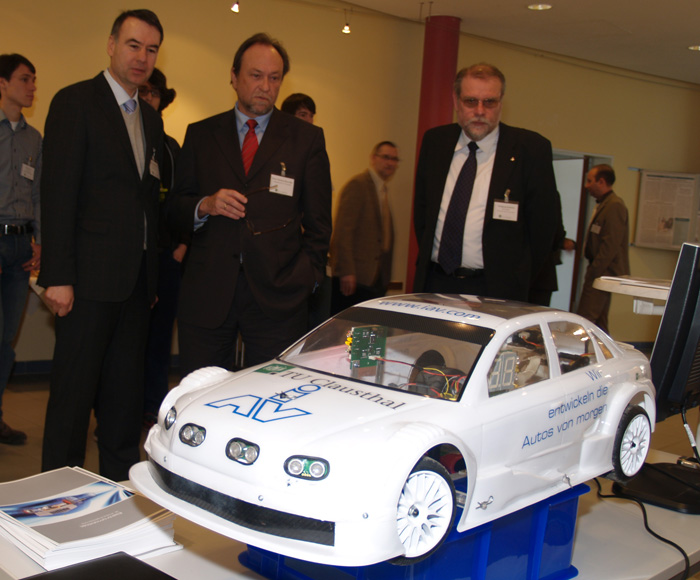 Der Modell-Rover, der den Wert eines Mittelklassewagens besitzt, ist ein Demonstrationsobjekt für technische Informatik. Damit es Fahrt aufnehmen konnte, arbeiteten Wissenschaft und Wirtschaft Hand in Hand. Im Rahmen des Workshops „Fahrzeuge und Fahrzeugtechnik“ nahm Universitätspräsident Professor Thomas Hanschke das Modell von Wolfgang Reimann, dem Bereichsleiter Fahrzeugelektronik bei der Ingenieurgesellschaft Auto und Verkehr (IAV), entgegen. Die IAV, ein Technikpartner der Autoindustrie mit weltweit 3000 Beschäftigten und Gifhorn als größtem Standort, „lebt vom Ingenieurnachwuchs“, betonte Reimann. „Wenn Deutschland weiter hochentwickelte Autos verkaufen will, dann brauchen wir qualifizierte Mitarbeiter.“ Aus diesem Grund unterstützte das Unternehmen den Clausthaler Lehrstuhl für Technische Informatik und Rechnersysteme von Professor Harald Richter bei der Entwicklung des 80 Zentimeter großen Vorführwagens. „Eine Technische Universität lebt von solchen Initiativen“, freute sich Professor Hanschke über die Kooperation.