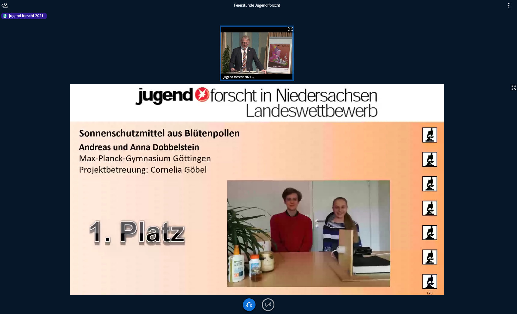 In vielen ihrer Projekte, die die Jugendlichen der Jury am Tag vor der Preisverleihung digital präsentiert hatten, ließen sie sich vom Gedanken der Nachhaltigkeit leiten. So beschäftigten sie sich zum Beispiel mit ressourceneffizienten Batterien und umweltfreundlichen Sonnenschutzmitteln – beide Projekte führten zum Landessieg: Im Fachgebiet Chemie entwickelten Tobias Reinert (16 Jahre) und Fabian Stutzke (15) vom Gymnasium Sulingen eine „Redox-Flow-Batterie“ weiter. Dazu verbesserten sie den Aufbau, um die benötigten Elektrolytflüssigkeiten schneller zu tauschen. So ließe sich etwa bei Elektroautos das Problem langer Ladezeiten besser lösen. Im Fachgebiet Biologie waren Andreas (17) und Anna (13) Dobbelstein vom Max-Planck-Gymnasium Göttingen erfolgreich. Sie befassten sich mit dem Problem, dass Sonnencremes, die durch Badende ins Meerwasser gelangen, Küstenbiotope schädigen. Um Abhilfe zu schaffen, stellten sie aus Blütenpollenextrakten ein umweltfreundliches Sonnenschutzmittel her.