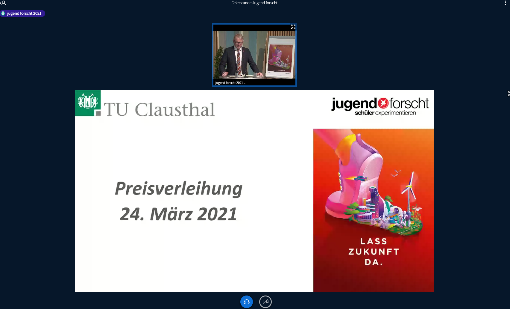 Eröffnet hatte die Preisverleihung Dr. Daniel Osewold. Der Landeswettbewerbsleiter freute sich, dass die Zahl der Teilnehmenden in Niedersachsen auch in Corona-Zeiten stabil geblieben ist. Zudem nutzte er die Feierstunde, um sich für die reibungslose digitale Ausrichtung des dreitägigen Jugend-forscht-Events zu bedanken. Neben dem Rechenzentrum der TU Clausthal erwähnte er insbesondere die Patenbeauftragte des Wettbewerbs, Maria Schütte. Zum 20. Mal kümmerte sie sich auf Seiten der Universität in bewährter Form um die Durchführung des Landesfinales.