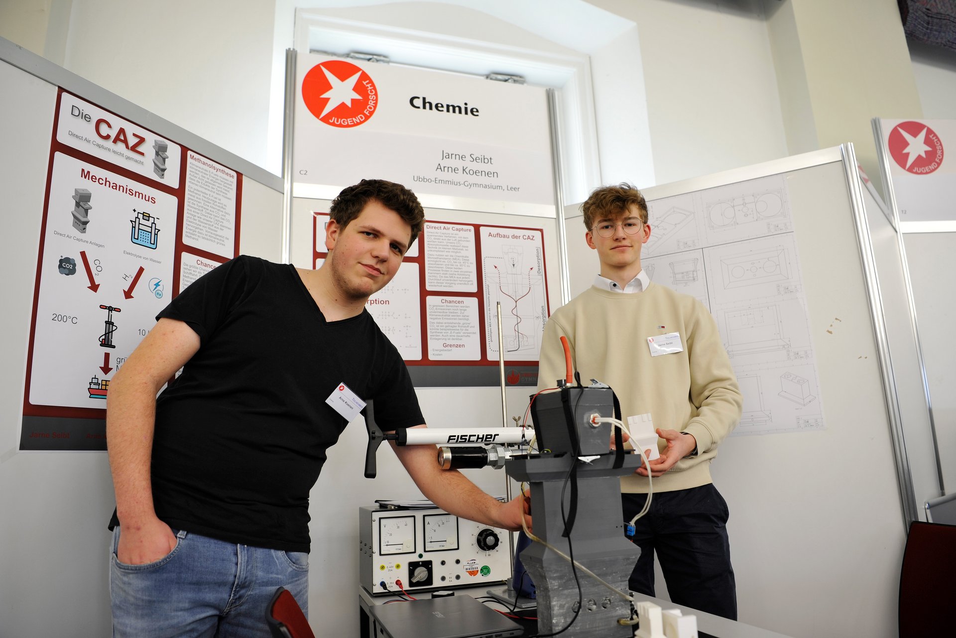 Gleich mehrere Schülerinnen und Schüler, die sich mit diesen Themen beschäftigten, erlangten den Landessieg in einer der sieben Kategorien. So waren Jarne Seibt und Arne Koenen vom Ubbo-Emmius-Gymnasium in Leer im Fachgebiet Chemie erfolgreich. Die 19-Jährigen nutzten ein „Direct Air Capture“ genanntes Verfahren, bei dem CO2 wie mit einem Staubsauger aus der Luft gesogen wird. Sie bauten ein eigenes Filtersystem, und es gelang ihnen mit dem Einsatz von Chemikalien, CO2 bei 35 bis 40 Grad Celsius zu binden und anschließend zu verarbeiten.