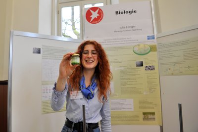 Glückwunsch: Julia Lenger (Papenburg) freute sich über den Landessieg im Fachgebiet Biologie. In der Kategorie Chemie (siehe Bilder unten) waren Jarne Seibt und Arne Koenen aus Leer erfolgreich. Die Preisverleihung fand vor rund 200 Gästen in der Clausthaler Aula statt. Zuvor hatten Interessierte die Möglichkeit, die insgesamt 42 Jugend-forscht-Projekte zu besichtigen. Fotos: Christian Ernst