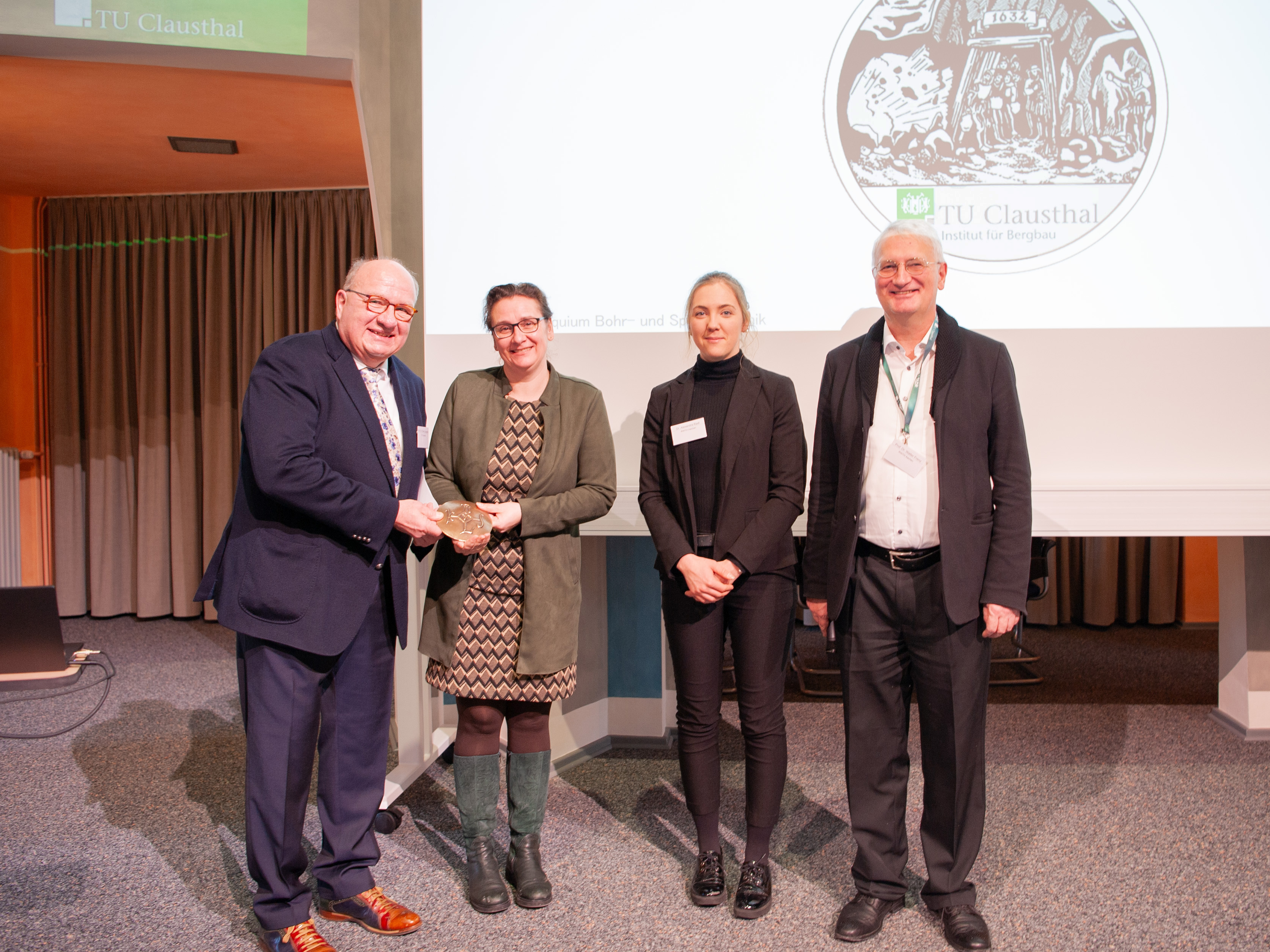 Professor Oliver Langefeld (von links) und die Clausthaler Universitätspräsidentin Dr.-Ing Sylvia Schattauer nehmen von Dr.-Ing. Alexandra Radl und Prof. Walter Frenz (beide RWTH Aachen) eine Karlsmedaille (siehe auch weitere Bilder) als Geburtstagsgeschenk entgegen. Zuvor hatte Prof. Elisabeth Clausen per Videobotschaft aus Aachen ihrer früheren Universität zum 250-jährigen Jubiläum gratuliert. Annähernd 300 Personen nahmen am Kolloquium teil. Fotos: Ernst, Jakubus, Institut