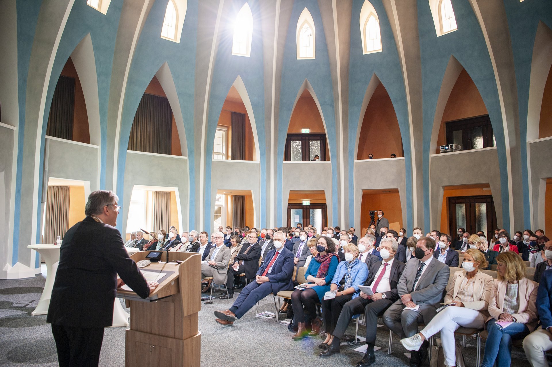 Das Staunen stand vielen Gästen ins Gesicht geschrieben: Im Kuppelsaal der Aula Academica laufen 16 Säulen in 14 Metern Höhe sternförmig zusammen und bilden einen imposant leuchtenden Mittelpunkt aus Blattgold. Nicht nur das Form-, auch das Farbspiel mit Lachsrosa-, Petrol- und Grautönen verleiht dem Saal etwas Erhabenes, so dass der Architekturhistoriker Privatdozent Dr. Ulrich Knufinke in seinem Festvortrag vom „Allerheiligsten der TU Clausthal“ sprach. Nachdem das Gebäude zunächst außen und danach innen denkmalgerecht restauriert wurde, ist es nun im Beisein des niedersächsischen Wissenschaftsministers Björn Thümler und 150 Gästen feierlich eröffnet worden. Die Aula erstrahlt wieder in ihrer ursprünglichen Schönheit.