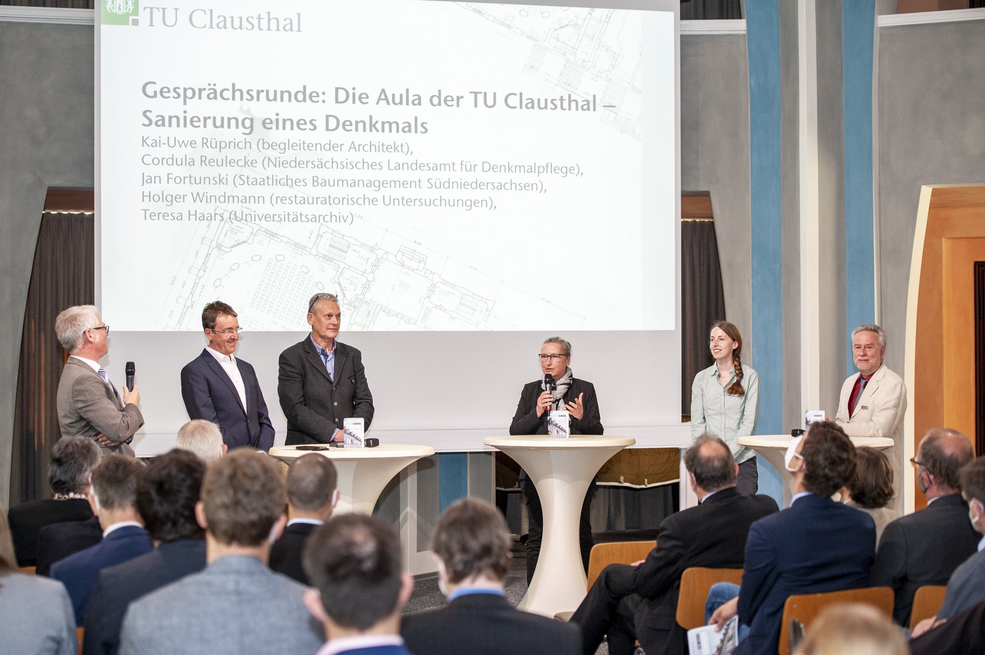Den Abschluss des Festaktes bildete eine kurzweilige Interviewrunde. Moderator Hannes Schlender führte sie mit Kai-Uwe Rüprich, dem begleitenden Architekten, Cordula Reulecke vom Landesamt für Denkmalpflege, Jan Fortunski (Staatliches Baumanagement Südniedersachsen), Restaurator Holger Windmann und Teresa Haars (Universitätsarchiv Clausthal). „Die Sanierung war für alle Beteiligten eine ganz tolle Geschichte“, sagte Rüprich, „wir haben das Denkmal Aula Academica ein Stück weit in die heutige Zeit mitgenommen, indem wir die Themen Schadstoffe, Brandschutz und Technik auf den heutigen Stand gebracht haben.“